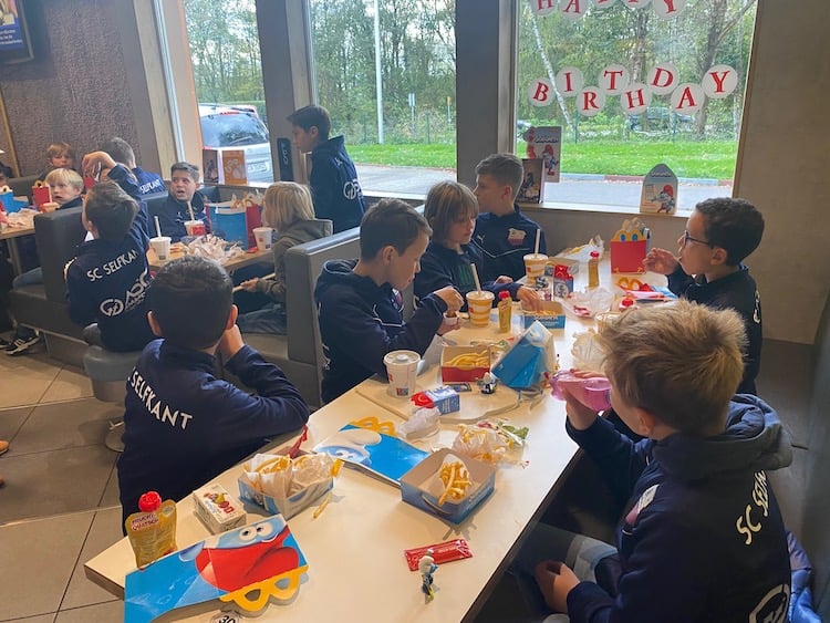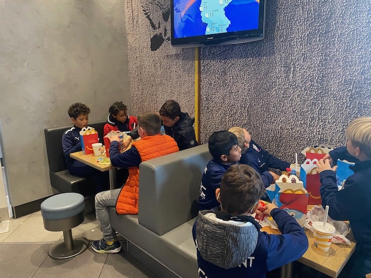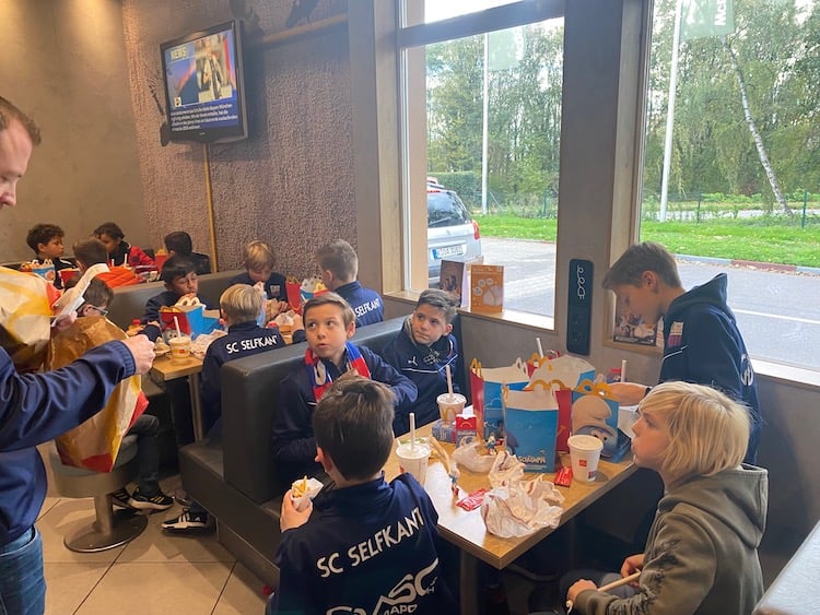 Vor dem Stadionbesuch gab es beim „goldenen M“ noch eine Stärkung. Für die zwei Geburtstagskinder der Woche Marlon und Mats wurde auf dem Parkplatz ein Ständchen gesungen.
