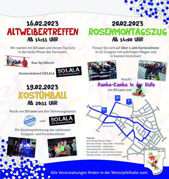 Nun steht also der Endspurt der Session an. Am Altweiberdonnerstag, den 16. Februar laden wir nach dem Schulkarneval ab 14:11Uhr zum Altweibertreffen in die Westzipfelhalle ein. Hier wird DJ Leon die „alten Weiber“ zum Tanzen bringen. Mit Livemusik werden die Stimmungsbands „So!LALA“ und Duo „Op Kölsch“ die Stimmung bis in den Abend hochhalten. Zum Einstimmen auf den Rosenmontag findet für das närrische Volk am Karnevalssonntag, ab 20:11Uhr der Kostümball in der Westzipfelhalle statt. So manche Gruppe und „Buurt“ nutzt die Gelegenheit, hier mit kreativen Kostümen für Aufmerksamkeit zu sorgen. Wie in jedem Jahr wird wieder eine Kostümprämierung der schönsten Gruppen und Einzelkostüme stattfinden. Während des Kostümballs sorgen die Bands „So!LALA“ und „Rabatz“ sowie DJ Leon für die musikalische Unterhaltung. Höhepunkt der Session, ist natürlich der Rosenmontagszug am20. Februar. Dieser startet um 14.00Uhr seinen Weg durch die Straßen von Tüddern. Es werden wieder über 1400 aktive Karnevalisten erwartet, die in bunten Fußgruppen mit prächtigen Wagen, bunten Kostümen und dorfpolitischer Satire am Rosenmontagszug teilnehmen werden. Für die kleinen Besucher werden wieder reichlich Kamelle verteilt. Ab 13.00 Uhr können sich die Besucher des Rosenmontagszuges an den Getränkeständen am Rand der Zugstrecke an einem kühlen Getränk oder einem warmen Glühwein erfreuen. Im Anschluss an den Rosenmontagszug geht es dann weiter mit Ramba-Zamba in der Westzipfelhalle. Für prächtige Stimmung sorgt dann DJ Leon und der Stimmungssänger „Walter Ego“. Der Abschluss einer jeden Karnevalssession in Tüddern ist die traditionelle Landpartie. Der Abend endet mit dem Witsemann-Verbrennen am Restaurant Perle der Adria, wo im Anschluss der „Ballonneball“ stattfindet. Auf Ihren Besuch freut sich die KG „De Witsemänn“ e.V. und besonders Kinderprinz Jan II. sowie das Prinzenpaar Pascal I und Prinzessin Vera.