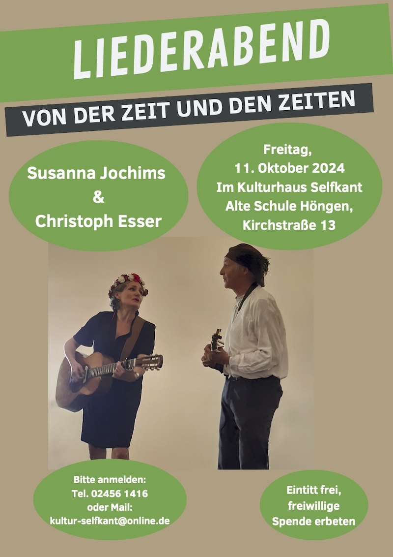 Am Freitag, 11. Oktober findet um 19:30 Uhr im Kulturhaus Selfkant in der alten Schule in Höngen ein Liederabend mit Susanna Jochims und Christoph Esser statt. Die beiden werden zum Motto „Von der Zeit und den Zeiten“ eine bunte Mischung von Liedern vortragen.