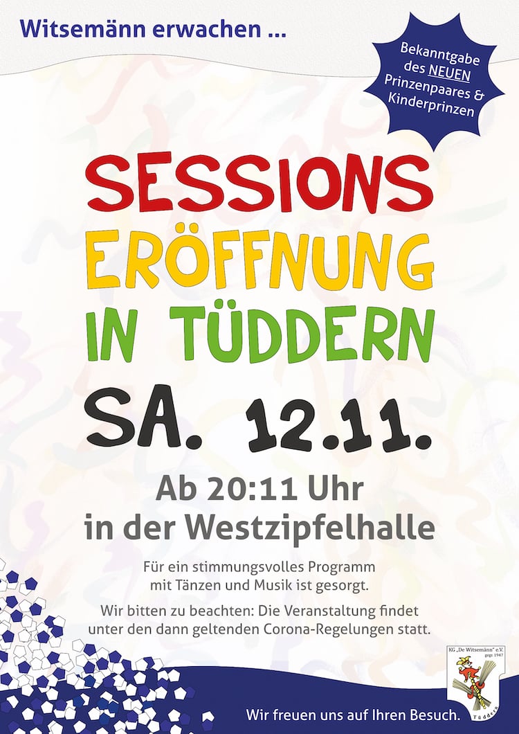 Nach zwei Jahren Pause gibt es wieder Anlass zur Freude, denn es ist endlich wieder die Zeit des Karnevals! Herzlich lädt die KG „De Witsemänn“ e.V. daher alle Karnevalistinnen und Karnevalisten und solche, die es werden möchten, zur Sessionseröffnung in die Westzipfelhalle in Tüddern ein. Wir öffnen Ihnen dort zum Beginn der fünften Jahreszeit am 12.11.2022 um 20:11 Uhr die Türen.