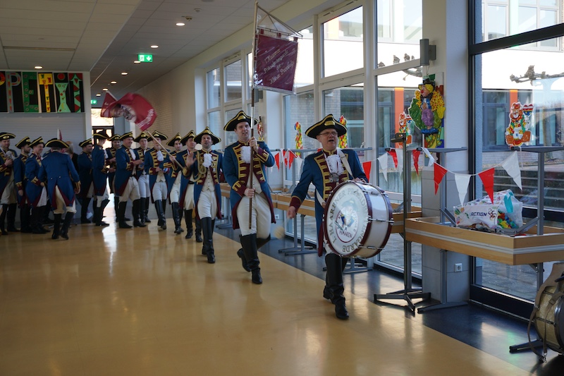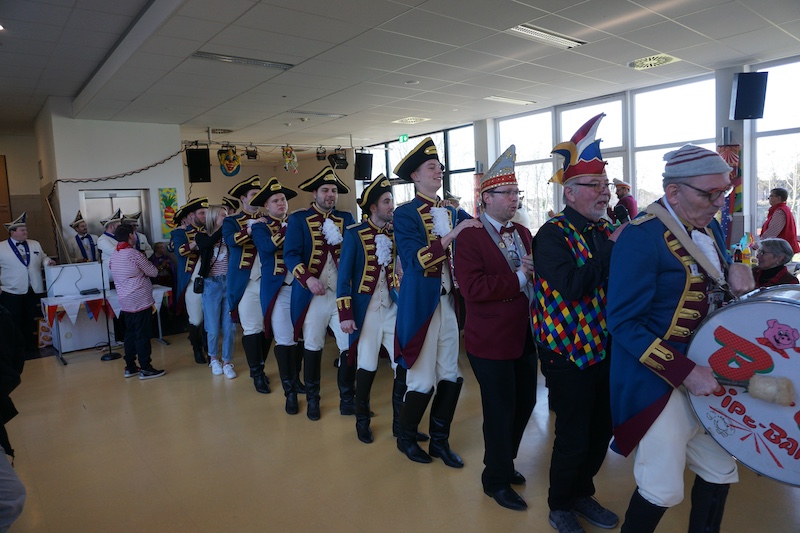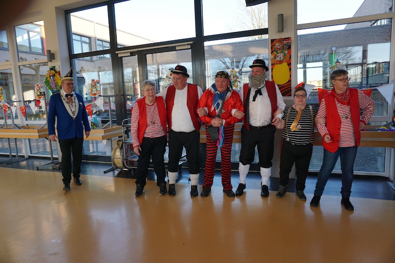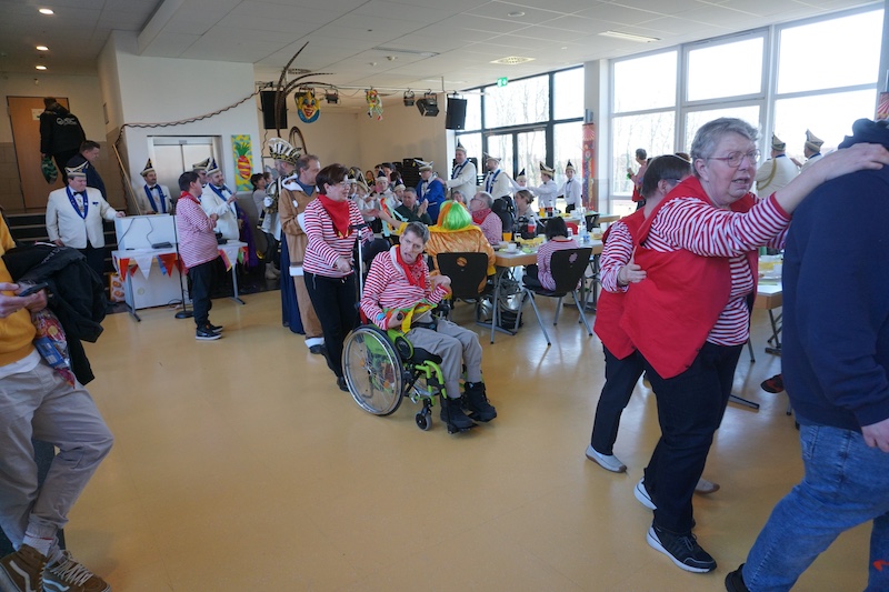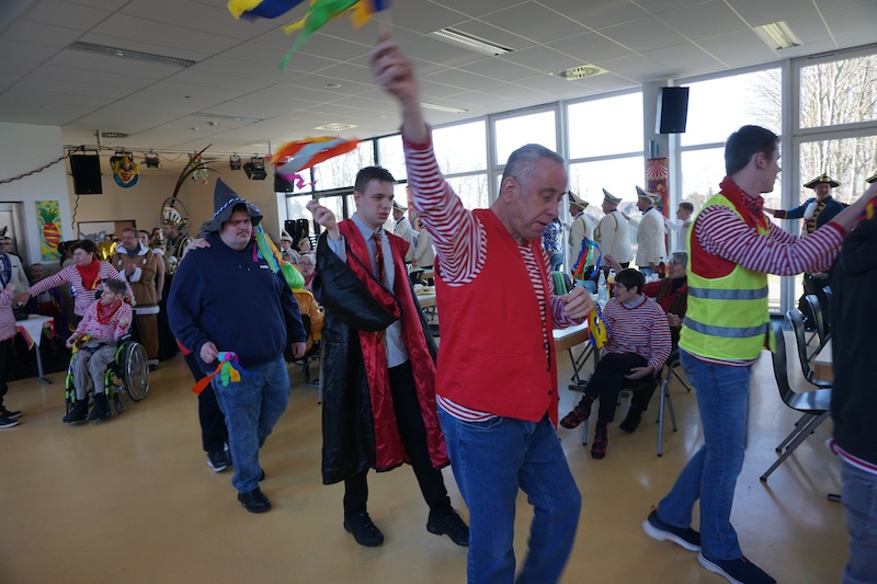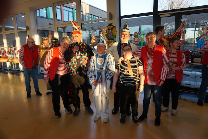 Nach 4 Jahren Pause feierte der Förderverein für Menschen mit geistig-körperlicher Behinderung im Selfkant mit seiner Betreuungsgruppe wieder Karneval. In der bunt geschmückten Mensa der Gesamtschule Gangelt-Selfkant begrüßte der 1. Vorsitzende Georg Meiers die zahlreichen Karnevalisten in ihren fantasievollen Kostümen. Zum Aufwärmen gab es erstmal eine Polonaise. Angeführt von der „Dicken Trumm“ drehte man ein paar Runden durch die Halle und spontan reihten sich auch die Gastvereine aus Tüddern und Haaren ein. Nachdem sich alle wieder auf der Bühne versammelt hatten erhielten die Menschen mit Handicap als erste den diesjährigen Hausorden, der später auch allen folgenden Akteuren übereicht wurde.