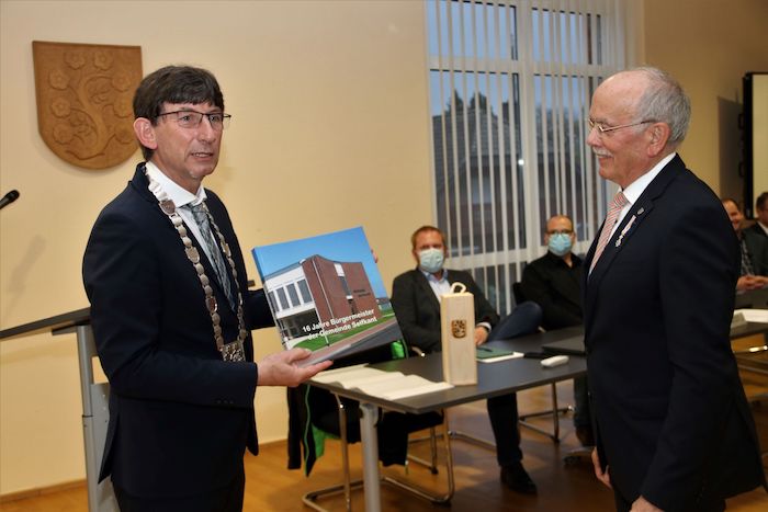 Die jetzige Pandemielage ließ endlich eine würdige Verabschiedung des Altbürgermeisters Herbert Corsten vor. Nach der Ratssitzung am Dienstag dankte Bürgermeister Norbert Reyans seinem Vorgänger für eine prägende Amtszeit: "Deine 16jähirge Amtszeit hat Spuren im Selflant hinterlassen" so Norbert Reyans zu Beginn seiner Laduatio. Reyans überreichte ein Bildgeschenk der Verwaltung der 16jähirgen Amtszeit, Vertreter des Rates überreichten ein Ölgemälde als Wertschätzung. Gattin Marie Jo erhielt als Dank einen bunten Blumenstrauß.