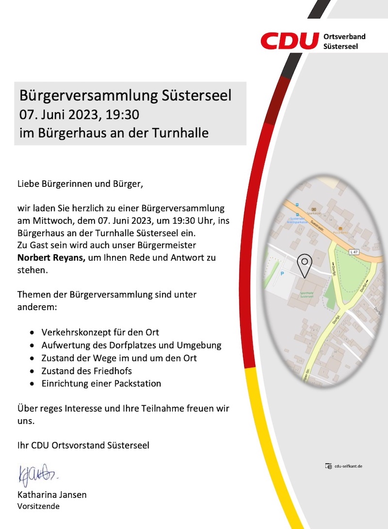 wir laden Sie herzlich zu einer Bürgerversammlung am Mittwoch, dem 07. Juni 2023, um 19:30 Uhr, ins Bürgerhaus an der Turnhalle Süsterseel ein.
