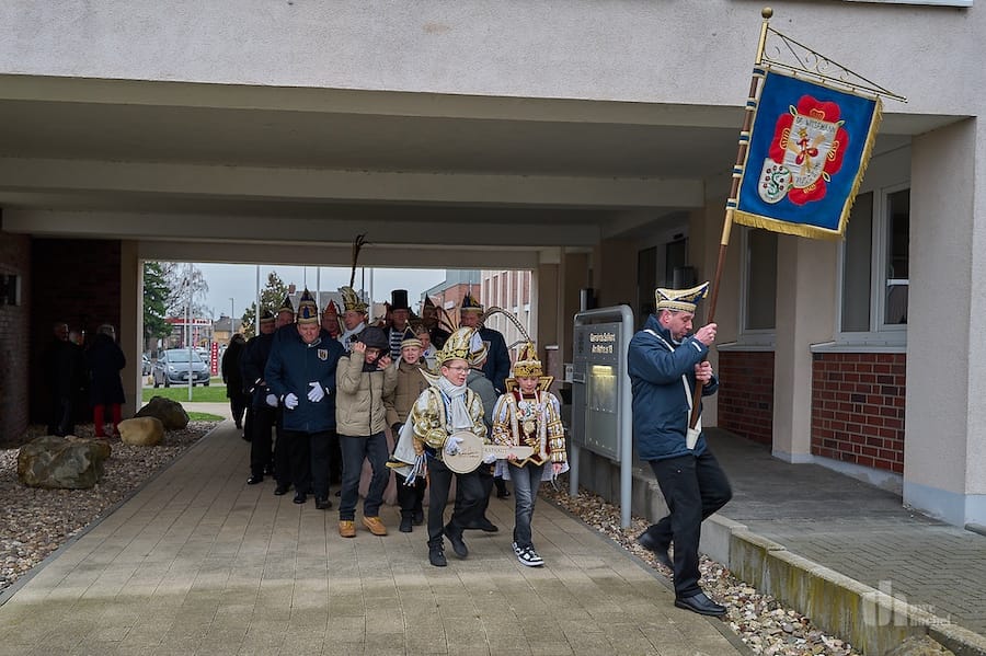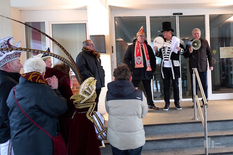 Unter Begleitung der Feuerwehr zogen 14:33 Uhr die Karnevalsvereine zum Rathaus. Der Bürgermeister und seine beiden Stellvertreter begrüßten die Karnevalsfreunde aus dem Selfkant. Gerard Küsters übergab bestens vorbereitet den Schlüssel des Rathauses widerstandslos an die Jecken. Schön, dass er trotz finanzieller Sorgen den Humor und den Optimismus nicht verloren hat. Dann startete ein fröhlicher Nachmittag in der Westzipfelhalle, den die Jecken und die Gemeinde bestens organisiert hatten.