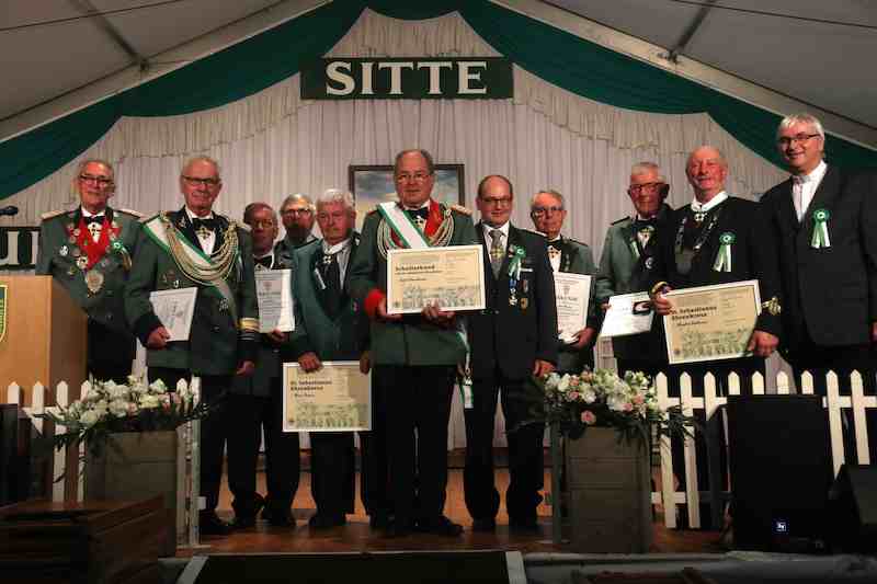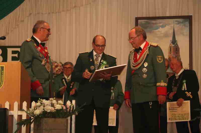 Jedes Dekanatsschützenfest hat im Grunde zwei Highlights. Meistens zum Auftakt mit dem Heimatabend. Durch das Programm führte elegant Roland Robertz. Die Ortsvereine sind mit eingebunden, Höhepunkt ist stetig der abschließende „Große Zapfenstreich“. Im Reigen der Auszeichnungen stach General Jakob Pannhausen heraus, er erhielt durch Vertreter des Diözesanverbandes Aachen das Schulterband zum St. Sebastianus Ehrenkreuz verliehen – eine der höchsten Auszeichnungen im Bund der historischen Deutschen Schützenbruderschaft.