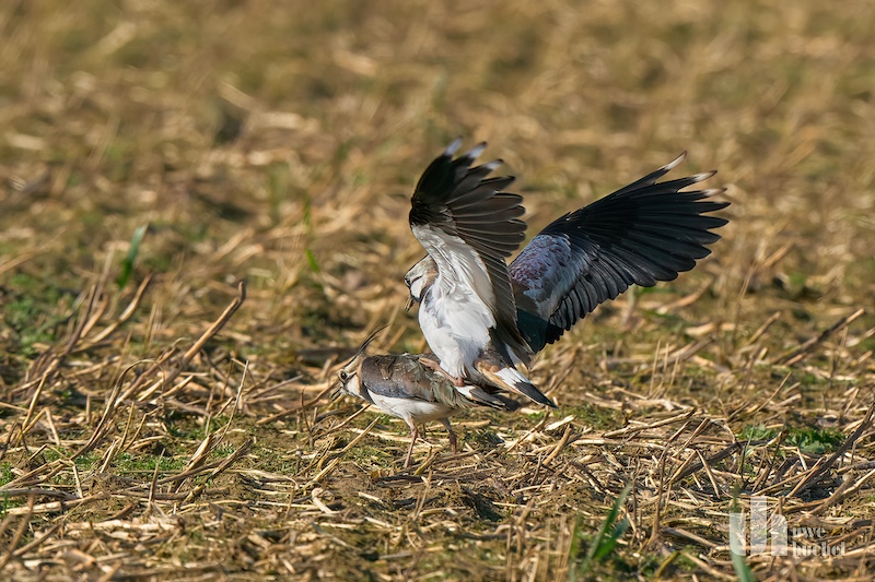 „Insbesondere die Männchen der Kiebitze verteidigen ihre Reviere und vollführen im Frühjahr beeindruckende Balzflüge. Dennoch werden geeignete Flächen häufig von mehreren Paaren in lockeren Kolonien besiedelt.“ /3/ Nähern sich Krähen oder Greifvögel dem Kiebitzrevier, starten die Männchen gemeinsam Abwehraktionen. Selbst Graureiher werden mit Erfolg attackiert und vertrieben. Nahrungssuchende Kiebitze deuten meist nicht auf einen Brutplatz in der Nähe hin.