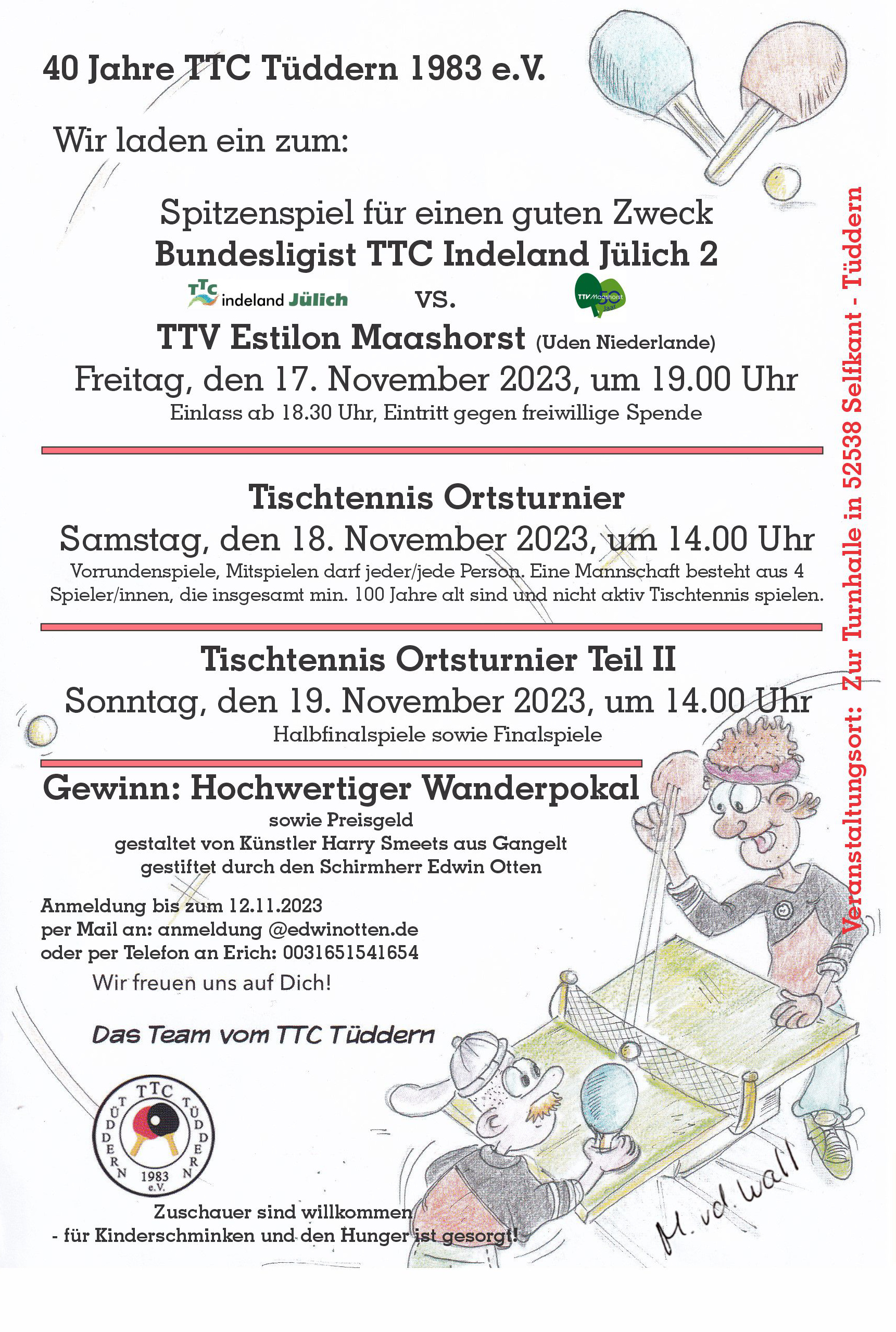 Am Freitag, dem 17.11. führt der TTC Tüddern ein Benefizturnier durch wo hochrangige Spieler im Tischtennissport wie der TTC Estilon Maashorst (Uden Niederlande) gegen den Bundesligist TTC Indeland Jülich 2 antritt. Alle Gelder gehen zugunsten der KinderChancenTafel in Oberbruch.