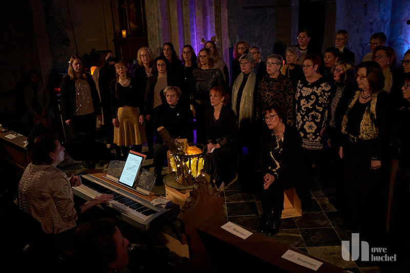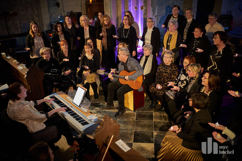 Die ca. 40 Sängerinnen haben an diesem Wochenende mit ihren 3 Konzerten in der Steinkirchener Kirche wieder einen neuen Meilenstein in ihrer Geschichte gesetzt. Die Aufführungen waren ein kreatives und unterhaltsame Beispiel, verschiedene musikalische Traditionen und Stile aus allen Teilen der Welt zu erkunden. Das Ensemble hatte sich mit der Violinistin Sylvia Rozen, dem Tenor Ben Heijnen und dem Duo Marcell (Gitarre/Bass) und Björn Knoops (Percussions) mehr als kompetente Unterstützung eingeladen.