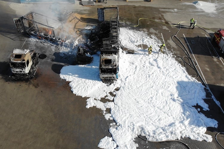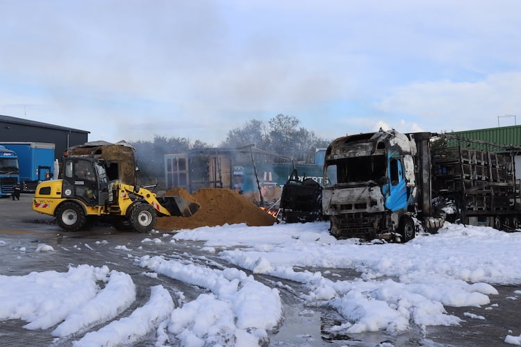 Bei dem Versuch schlimmeres zu verhindern, zog sich zudem ein Mitarbeiter der Spedition schwere Verbrennungen zu und musste zur weiteren Behandlung in ein nahe gelegenes Krankenhaus transportiert werden. Aufgrund der enormen Rauchentwicklung wurde der ABC-Zug des Kreises Heinsberg alarmiert, um Messungen auf Gefahrstoffe im Wirkungsbereich der Rauchwolke durchzuführen. Gleichzeitig wurde zur Vorsicht die Bevölkerung vor den Rauchgasen über die Warnapp Nina und über Radiodurchsagen gewarnt. Zusätzlich zu einem massiven Löschangriff wurden die angrenzenden Gebäude mit einer so genannten Riegelstellung geschützt. Hierzu wird eine Art Wasserwand zwischen den brennenden Lkw und der zu schützenden Halle aufgebaut, um so die Wärmebelastung für die Halle zu minimieren. Zwei Lkw hatten Kunststoffe geladen, welche mit Hilfe von Löschschaum gut eingedämmt werden können. Aus diesem Grund wurde der Abrollbehälter Schaum des Kreises Heinsberg zur Einsatzstelle nach Gangelt-Birgden entsendet. Der dritte Anhänger war jedoch mit Aluminiumgranulat beladen. Aluminiumgranulat brennt sehr heiß und bei Löschversuchen mit Wasser besteht die Gefahr, dass das Wasser in Sauerstoff und dem explosiven Wasserstoff gespalten wird. Effektive Löschmittel für Aluminiumbrände sind zum einen spezielle Metallbrandlöschmittel (Metallbrandpulver) oder trockener Sand. Glücklicherweise erklärte sich die Sandgrube Davids aus Geilenkirchen spontan bereit, die Löscharbeiten mit mehreren Lkw-Ladungen trockenem Sand zu unterstützen. Zudem stellte der Bauhof der Gemeinde Gangelt einen Radlader zur Verfügung, mit dessen Hilfe der trockene Sand auf die Brandstelle aufgetragen werden konnte. Da sich der Fahrer bei den Löscharbeiten in den Gefahrenbereich hätte begeben müssen, übernahm eine Einsatzkraft der Feuerwehr, unter leichtem Atemschutz, die Arbeiten mit dem Radlader. Da sich der Einsatzleitwagen der Feuerwehr Gangelt zum Zeitpunkt der Alarmierung nicht einsatzbereit in der Werkstatt befand, wurde der Einsatzleitwagen der Feuerwehr Geilenkirchen zur Unterstützung der Einsatzkräfte entsendet. Zudem unterstützte die Drohneneinheit der Feuerwehr Wassenberg die Einsatzleitung mit Luft- und Wärmebildaufnahmen, um eine bessere Übersicht über die Einsatzstelle zu erhalten. Da die Löscharbeiten bei sommerlichen Temperaturen um die dreißig grad sehr kräftezehrend für die Einsatzkräfte waren, versorgte die Einsatzeinheit NRW des Malteser Hilfsdienstes die Feuerwehrleute mit kalten Getränken und kleineren Snacks. Die drei beteiligten Lastkraftwagen wurden durch den Brand völlig zerstört. Zudem wurden mindestens fünf weitere Pkw durch die enorme Hitzestrahlung schwer beschädigt. Teilweise zersprang die Windschutzscheibe, teilweise schmolzen Nummernschilder, Lampen und Stoßstangen. Ein Übergreifen auf die Halle sowie eine Ausbreitung des Feuers auf die Pkw konnte jedoch verhindert werden. Bürgermeister Guido Willems machte sich persönlich vor Ort ein Bild von den Lösch- und Rettungsarbeiten der Einsatzkräfte und dankte den ehrenamtlichen Kräften für die gute und zielgerichtete Arbeit. Er freute sich, dass die gut aufgestellte und schlagfertige Feuerwehr der Gemeinde Gangelt bei diesem besonderen Einsatz auf die schnelle und unkomplizierte Hilfe der Einsatzkräfte aus dem Kreis Heinsberg und dem privaten Unternehmer setzen konnte. Da sich alle Einsatzkräfte der Feuerwehr Gangelt im Einsatz befanden, stellte die Feuerwehr Geilenkirchen den Grundschutz für die Gemeinde Gangelt sicher. Um im Falle eines eventuellen Paralleleinsatzes zeitnah Hilfe leisten zu können, wurden hierzu jeweils ein Löschfahrzeug aus Geilenkirchen-Würm und aus Geilenkirchen-Teveren gemeinsam mit einem Führungsfahrzeug der Feuerwehr Gangelt am Feuerwehr-Gerätehaus Gangelt postiert. Nach rund vier Stunden konnten die ersten der rund einhundert Einsatzkräfte herausgelöst werden. Zuvor bedankte sich der Einsatzleiter Günter Paulzen bei allen eingesetzten Kräften für die gute Leistung und die sehr gute Zusammenarbeit. Die Löscheinheit Birgden stellte anschließend noch eine Brandwache und führte kleinere Nachlöscharbeiten durch.
