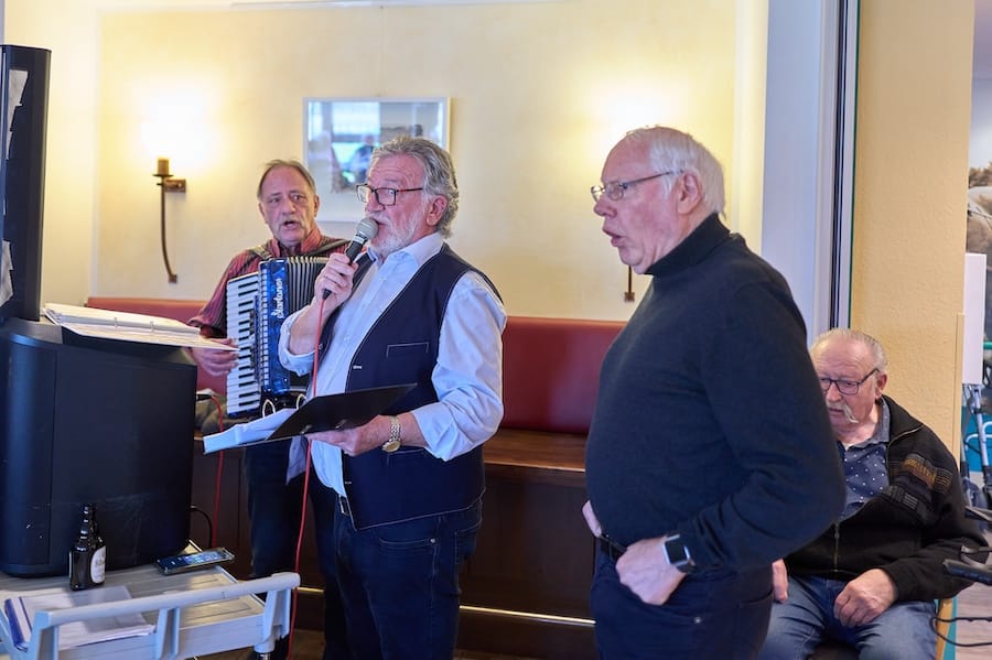 Wilfried Meessen und Jakob Paulzen engagieren sich im Seniorenheim St. Josef Höngen als ehrenamtliche Helfer. Sie laden die Bewohner u.a. zum gemeinschaftlichen Singen in Juppis Stube ein. Wilfried Meessen begleitet den Gesang mit dem Keyboard oder dem Akkordeon. Und die beiden Witsemänn a.D. sind immer noch in Bestform. Unterstützt werden sie von Gert Beckers.