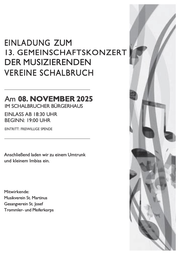 EINLADUNG ZUM 13. GEMEINSCHAFTSKONZERT DER MUSIZIERENDEN VEREINE SCHALBRUCH