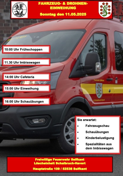 Die Löscheinheit Schalbruch-Havert der Freiwilligen Feuerwehr Selfkant lädt herzlich zur offiziellen Fahrzeug- und Drohneneinweihung am Sonntag, den 11. Mai 2025 ein.