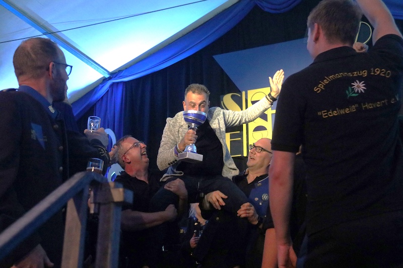 Was war das für ein Jubel in Havert am späten Sonntagnachmittag. Dem Spielmannszug Edelweiß gelang ausgerechnet bei den Jubiläumsfeierlichkeiten zum 100jährigen Bestehen der nächste Husarenstreich in der Vereinsgeschichte - sie holten sich erneut den "Musik award" der westlichsten Gemeinde Deutschlands. Der Spielmannszug Saeffelen-Koningsbosch holte Silber, Platz drei ging an Schalbruch. Havert siegt mit knappen Vorsprung von 292,5 zu 290,5 Punkten. Im Rennen um Rang drei gab es erstmals in der Musikgeschichte der Selfkantplakette eine Losentscheidung, Schalbruch und Wehr erhielten von den Preistrichtern jeweils 285,0 Punkte – Schirmherr Theo Tress zog Schalbruch auf Rang drei. Nach der Siegerehrung tanzte der Spielmannszug Edelweiß atemlos in die Nacht hinein...