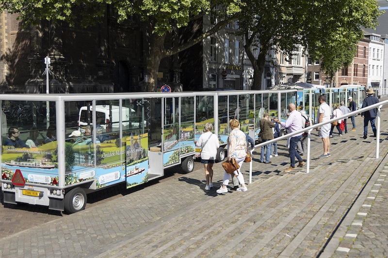 Das Gruppenfoto zeigt die Besucher an der Maaspromenade sowie den „Sonnenzug“ bei der Stadtrundfahrt.