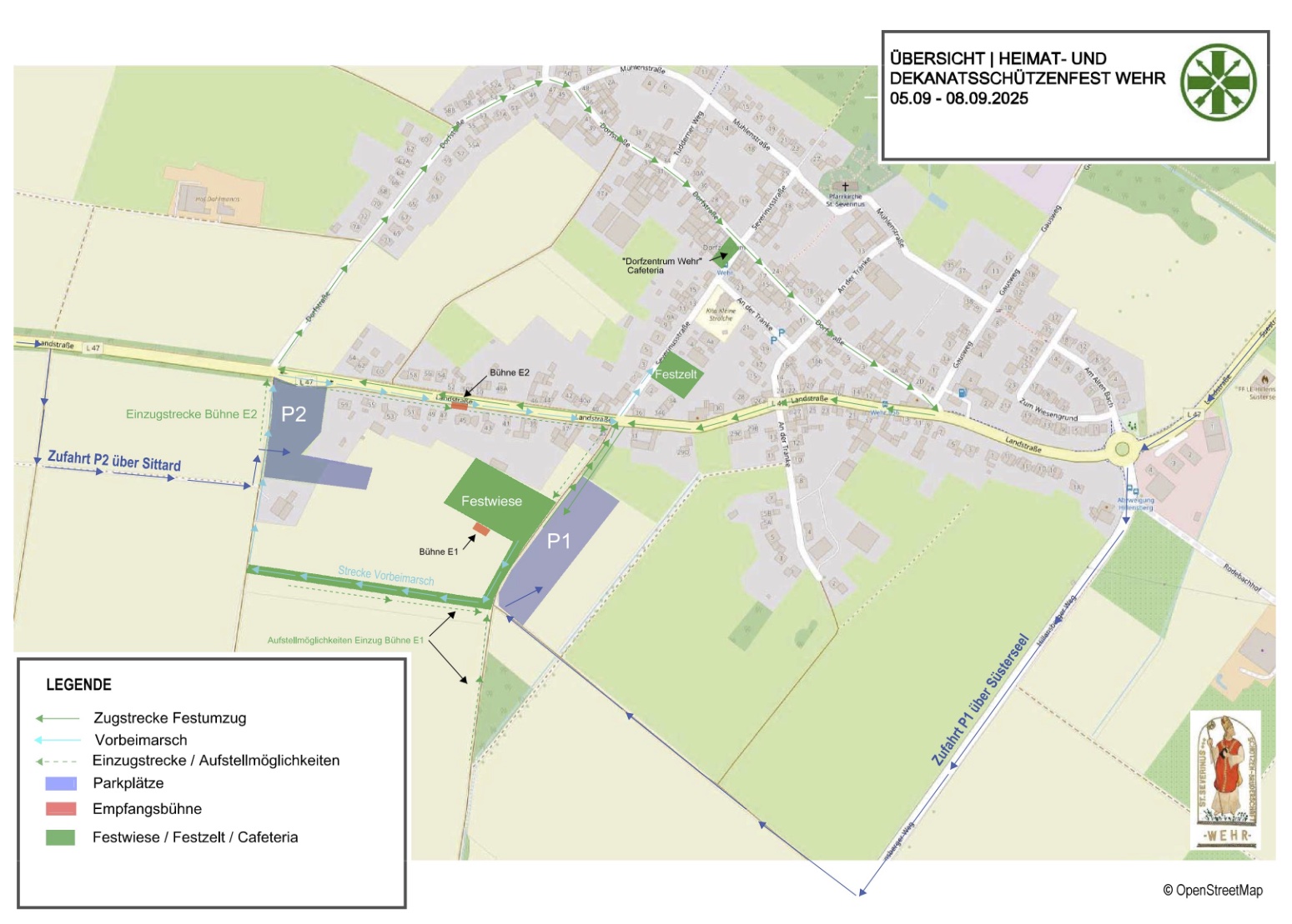 Ganz im Zeichen der Tradition unserer Schützenfeste wird der Sonntagnachmittag stehen, wenn die eingeladenen 20 Dekanatsbruderschaften sowie die Gäste aus Lieck, begleitet von ihren musizierenden Vereinen und ihren Majestäten, ab 13:00 Uhr mit klingendem Spiel in den Ort einziehen werden. Hierzu wird ab 12:30 Uhr die Ortsdurchfahrt durch Wehr gesperrt sein.
