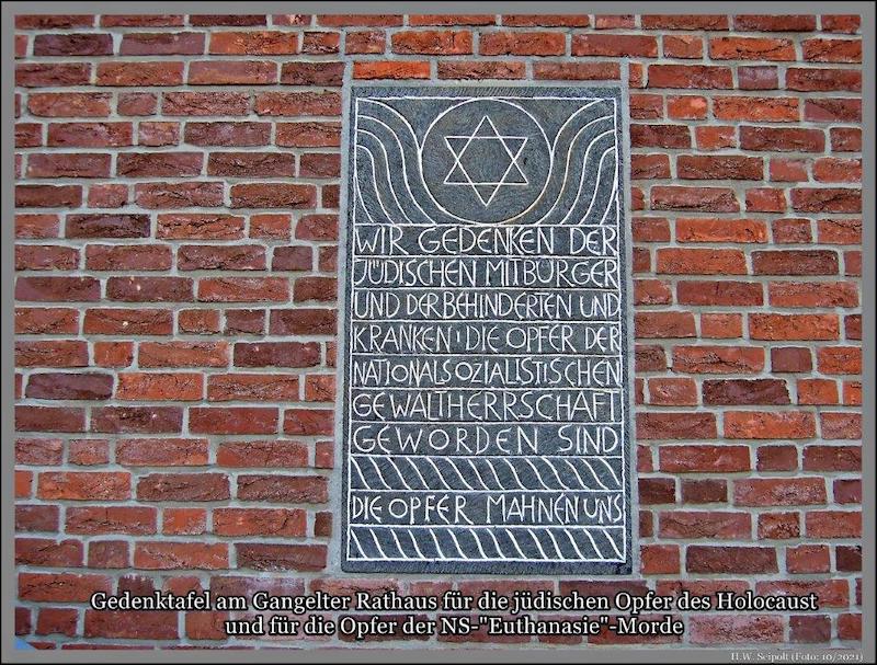 Wir haben die Pflicht, uns an beide Opfergruppen zu erinnern, so wie die Gedenktafel am Rathaus, enthüllt am 9. November 1991, für alle sichtbar an die jüdischen Holocaust- und “Euthanasie”-Opfer im Ort mahnt. Gangelt ist mit Abstand der Ort innerhalb des Kreises Heinsberg, der nachweisbar mit fast 300 ermordeten Menschen die höchste NS-Opferzahl aus dem Holocaust und den Krankentötungen im Rahmen der NS-„Euthanasie“ zu verzeichnen hat (rd. 40 jüdische Gangelter Bürger und rd. 260 Behinderte der Anstalt Gangelt). Wir stehen alle im dunklen Schatten dieses lokal-historischen Faktums und dieser schweren Bürde: ein Tatort, Leidensort und Trauerort - daran erinnert uns schon seit drei Jahrzehnten die Mahntafel am Gangelter Rathaus!