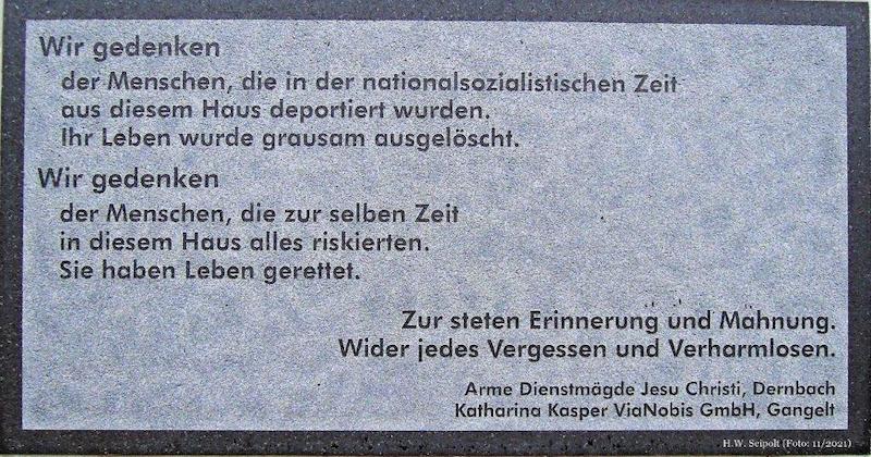 Beim Durchlesen stellte ich zu meiner Überraschung fest, dass über die menschenverachtende NS-Gesundheitspolitik bis zu den Krankenmorden im Rahmen der NS-„Euthanasie“ in der damaligen Anstalt Gangelt „Maria Hilf“ keine weiteren Erläuterungen gegeben werden, allenfalls sehr dürftig im Zusammenhang einer Inschrift auf einer Gedenktafel der Via Nobis-Facheinrichtung in der Katharina-Kaspar-Straße (früher: Bruchstraße).