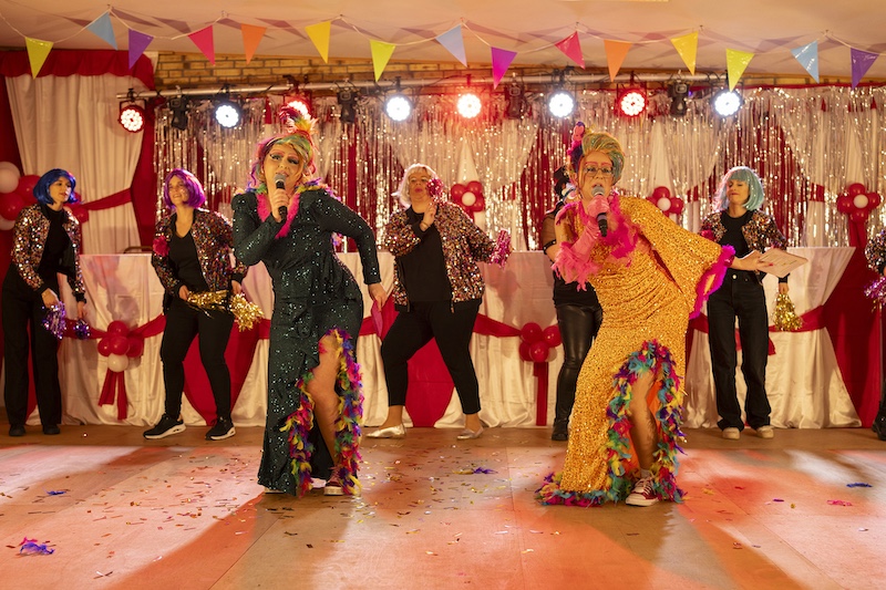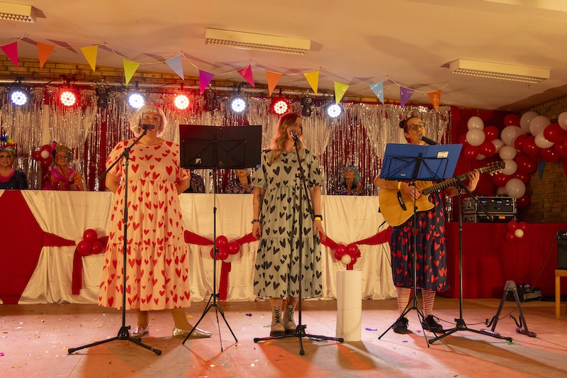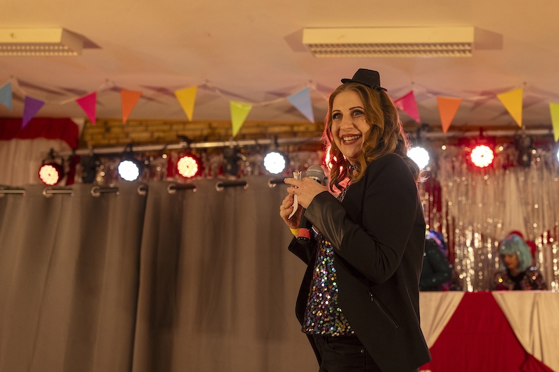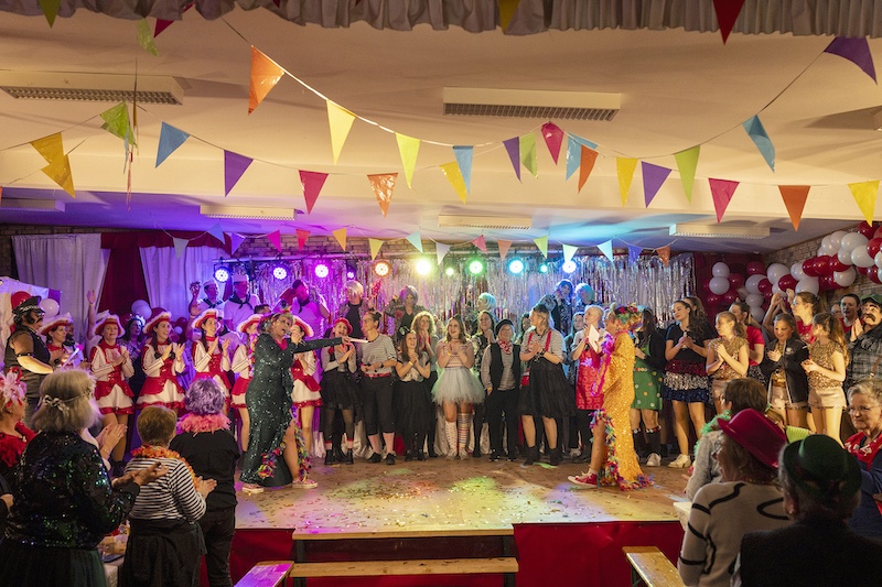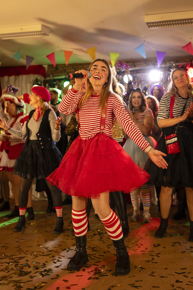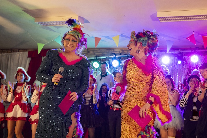 Am 7. Februar war es endlich soweit. Nachdem sich im vergangenen Jahr die Höngener Frauengemeinschaft neu gegründet hatte, ließen sie auch die Frauensitzung wieder zum Leben erwecken. Eröffnet wurde die Frauensitzung von den Mädels des KC-VÜSS, die die Moderatorinnen des Abends Julia Keulen und Silke Vraetz auf der Bühne präsentierten. Sie brachten als Dragqueens die Bühne zum Funkeln und heizten die Halle mit einem Warm-Up auf Boogie Wonderland ein. Das Publikum merkte schnell, dass dies keine gewöhnliche Frauensitzung war. Spätestens als der Hoppeditz Mr. G-Punkt (Silke Grein) mit Hüftschwung Richtung Bühne unterwegs war, war das Gekreische groß.
