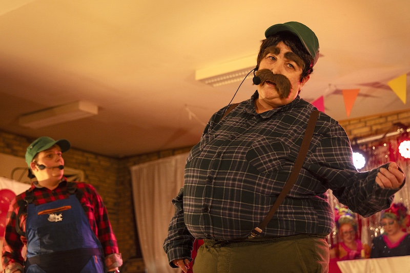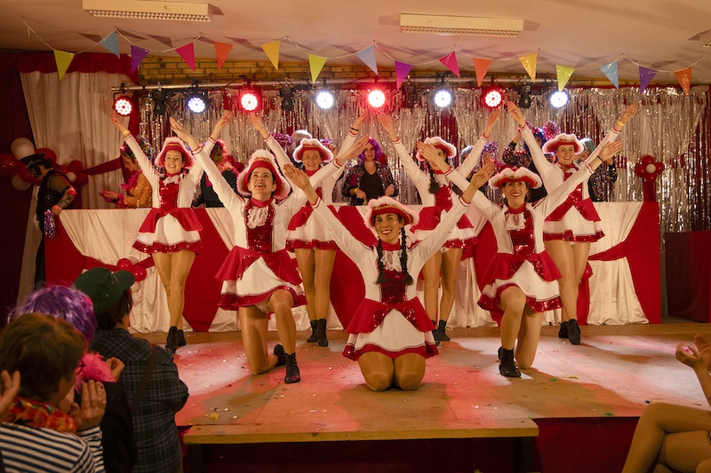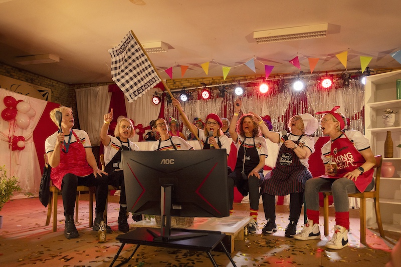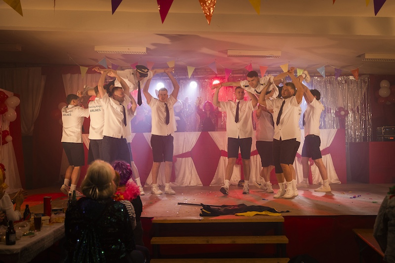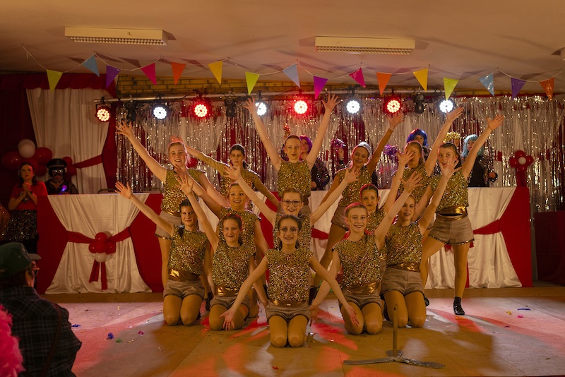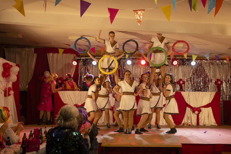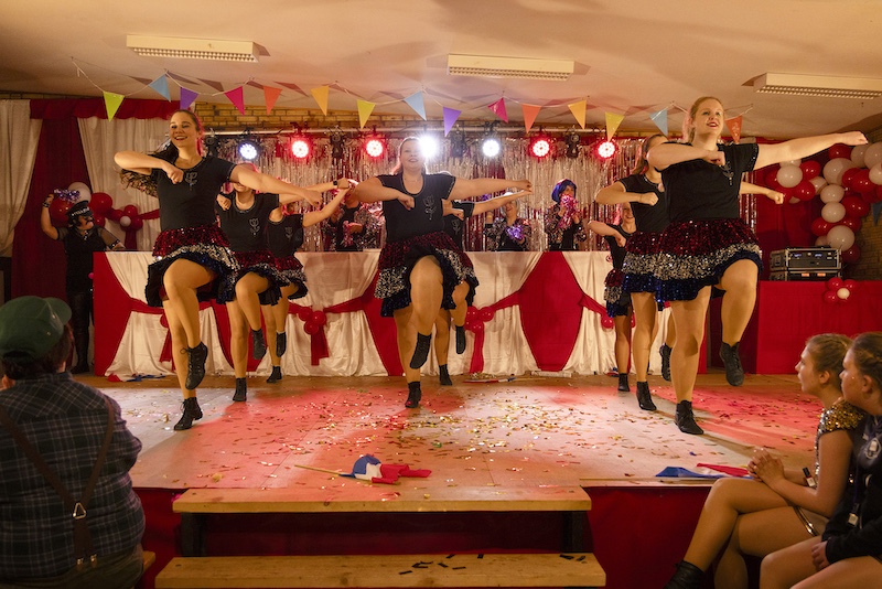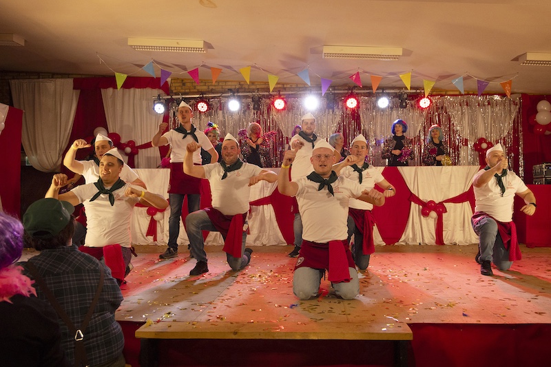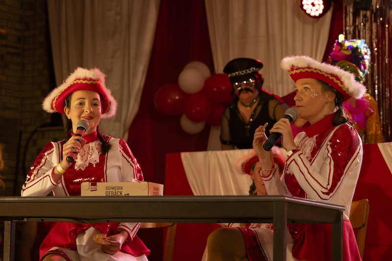 Eine ganz neue Gruppierung, die auch zum allerersten Mal auf der Höngener Bühne stand, war die Gruppe „Trinkt gut“, die das Publikum in ihren Sketch integrierte. Sie verwandelte die Schützenhalle in einen Escape-Room, führte die Höngener Frauen durch verschiedene TV-Formate und zusammen lösten sie das knifflige Rätselwort “ALAAF“. Eingeflogen aus Tüddern kamen die Piloten des Männerballetts „The Dancing Kings“ unter der Leitung des Höngener Mädchens Jule Görtz. Dann sorgte das seit 2017 auf der Höngener Bühne vertretene Duo „Claudia & Sylvia“ als „Zwei Bauern suchen eine Frau“ für viele Lacher mit ihren Witzen und die Halle sang bei der finalen Playback- Einlage der Beiden aus voller Seele mit.