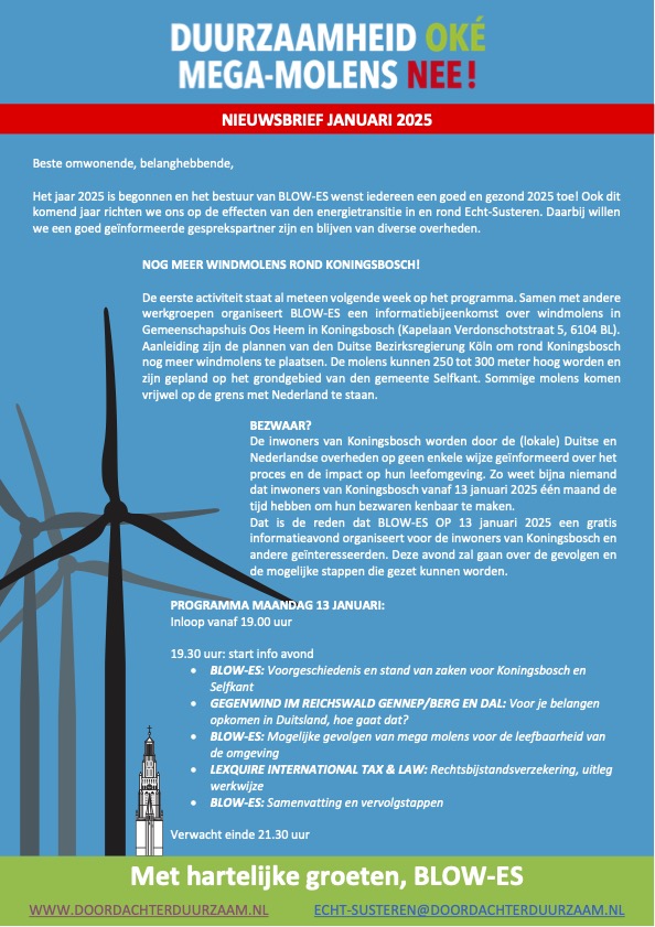 Die Bürgerinitiative BLOW-ES, welche in unserer niederländischen Nachbargemeinde Echt - Susteren aktiv ist, organisiert am Montag den 13.01.2025 einen Informationsabend zum Thema :