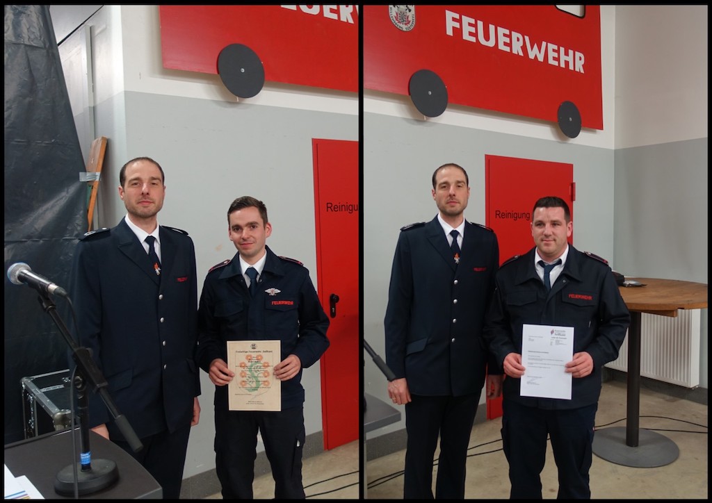 Zum Oberfeuerwehrmann wurden Younnes Achmaoui, Marvin Beckers, Tobias Conen, Nico Dahlmanns, Gijs de Kever, Tim Heinrichs, Bob Houben, Yannik van Mulken, Patrick Ruers, Lars Kelleners, Kim Peters, Lina Schmitz, Philipp Schmitz, Bart Schielke, Nils Spätgens und Tom Zaunbrecher, zum Hauptfeuerwehrmann Sascha Schmidtchen, Stefan Mertens und Ruud Smulders sowie zum Unterbrandmeister Clemens Hilgers und Kai Meulenberg befördert.
