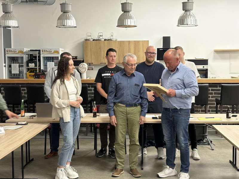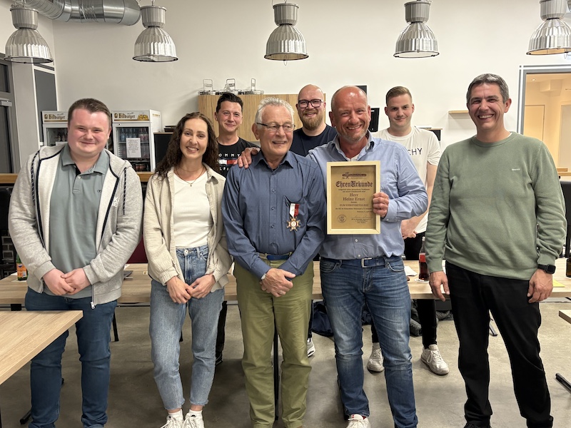 Heinz Ernst Engagement wurde nach der Abstimmung mit Standing Ovations gewürdigt. Ralf Beyers übergab ihm zusammen mit einigen Vorstandsvertretern eine kleine Ehrenurkunde und einen Ehrenmitgliedsanstecker. Heinz Ernst bedankte sich auf seine Art und Weise für die Ernennung zum Ehrenmitglied.