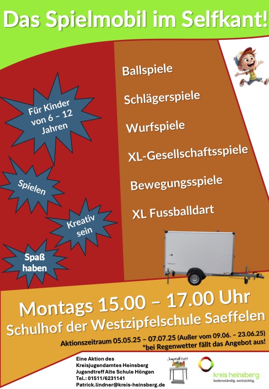 Als feste Anlaufstelle besucht das Spielmobil dann jeden Montag von 15.00 – 18.00 Uhr die Westzipfelschule in Saeffelen und jeden Donnerstag von 15.00 – 18.00 Uhr den Jugendclub Arearea in Tüddern. Ausgenommen hiervon sind Regentage, Feiertage sowie der Zeitraum vom 16. – 27.06.2025.