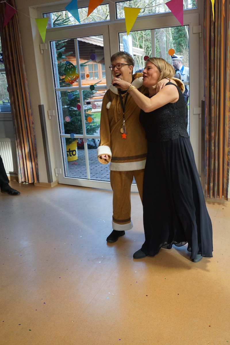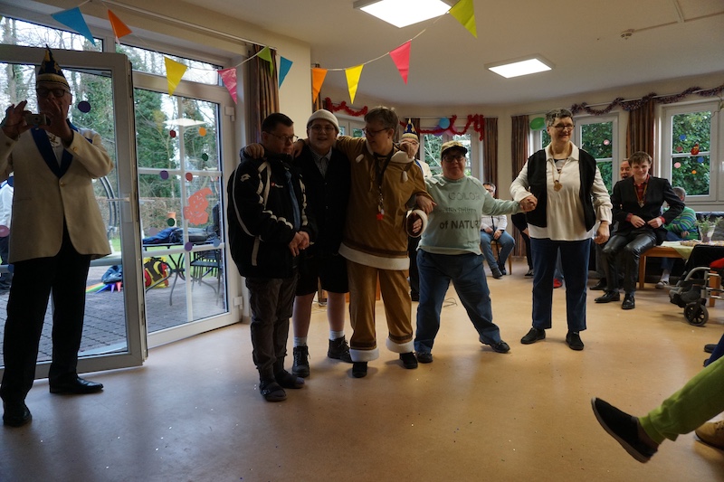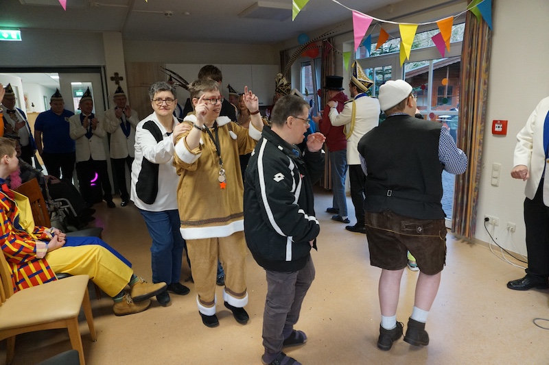 Die Karnevalisten der Witsemänn aus Tüddern besuchten die Lebenshilfe-Wohnstätte in Höngen. Der Elferrat, Prinz Julian I., Prinzessin Lena sowie Kinderprinz Till I. und ihr Gefolge wurden von den kostümierten Bewohnern mit herzlichem Applaus empfangen. Nachdem man sich mit einer Polonäse aufgewärmt hatte, startete das Programm. Eine Gruppe junger Tänzerinnen begeisterte durch einen akrobatischen Tanz mit Hula-Hoop-Reifen. Dann folgte die Boygroup „Die Hosenträger“. Höhepunkt war die vom Ehrenpräsidenten „Köb“ Paulzen moderierte Playbackshow. Als Beatrice Egli, Howard Carpendale und DJ Ötzi auftraten, hielt es die Bewohner nicht mehr auf ihren Plätzen und man sang lautstark mit. Zum Abschluss verteilte Kinderprinz Till I. mit seinen Adjutanten Mats und Max noch Süßigkeiten.