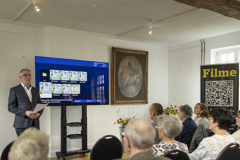 Denn es stand die Uraufführung des Films „Kirchenführung in der Millener Kirche mit Gotthard Grein“ auf dem Programm, der von Leon Pisters unter Mitwirkung des Vorstandes und Organist Nicolai Dreissen mit viel Zeit- und Arbeitsaufwand Ende 2024 fertiggestellt wurde. Paul Beckers würdigte in seiner Begrüßungsansprache nochmals das Wirken den im Jahr 2024 verstorbenen Gotthard Grein für die Heimatvereinigung Selfkant mit seinen immer wieder fesselnden und inspirierenden Kirchenführungen in der Kirche von Millen. Er betonte weiterhin, dass Gotthard Grein‘s unzählig initiierte Führungen über das kirchliche Leben in Millen weit über die Grenzen hinaus bereichert haben. Damit wird nicht nur sein Lebenswerk gewürdigt, sondern auch seine Werte, die er vermittelt hat, weitergetragen.