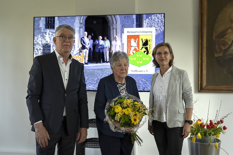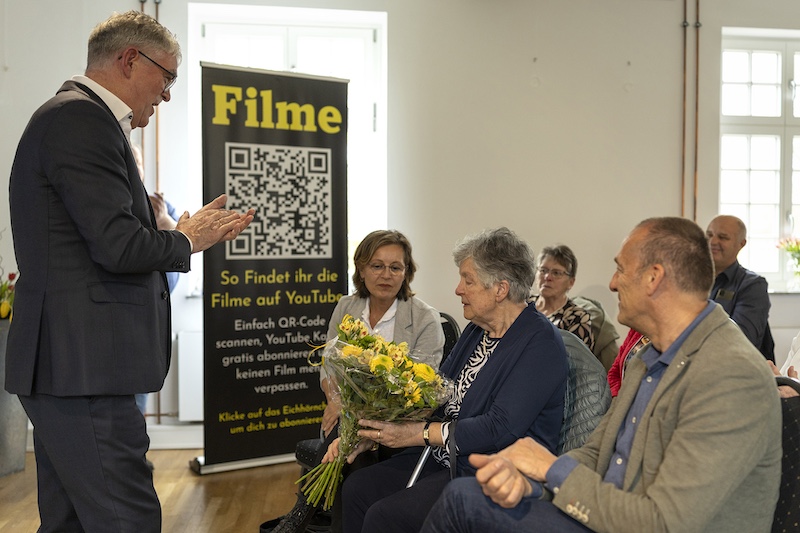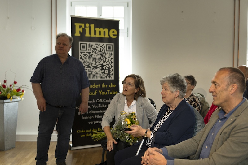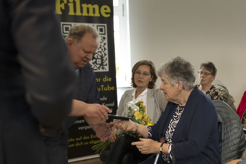 Paul Beckers äußerte abschließend die Bitte: „Lassen sie uns gemeinsam dafür sorgen, dass sein Erbe in unserer Heimatvereinigung und Gemeinde weiterlebt und wir die von ihm gesäten Samen dieser Kirchenführungen weiter pflegen“. Bevor Witwe Corry Grein unter viel Beifall den „Startschuss“ gab, überreichte ihr Paul Beckers als Dank und Anerkennung einen Blumenstrauß. Die Filmuraufführung hinterließ bei allen Anwesenden einen sehr positiven Eindruck, von der sie hellauf begeistern waren.