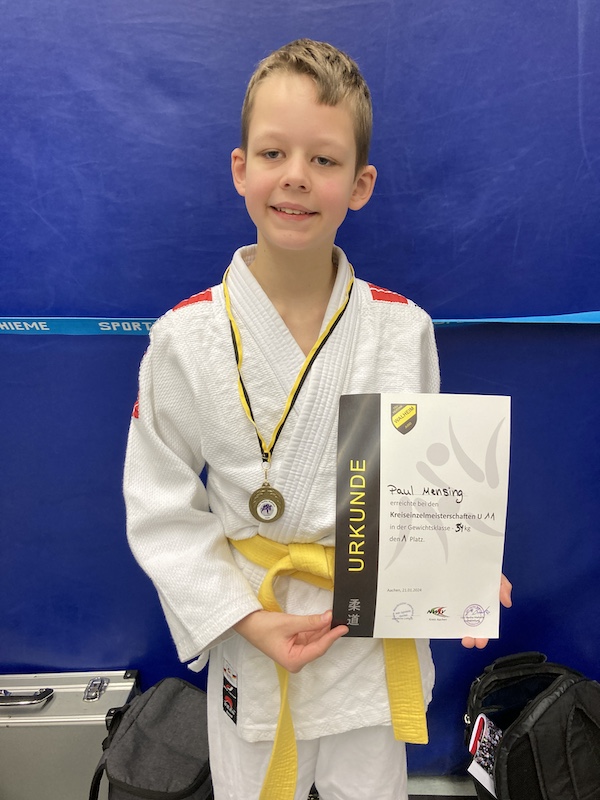 Als erstes starteten die jüngsten Wettkämpfer der Jugend unter 11 Jahren bei den Kreis Einzelmeisterschaften in Aachen – Kornelimünster. Mit drei gewonnenen Kämpfen erzielte Paul Mensing den Titel des Kreismeisters in der Gewichtsklasse bis 34 kg.