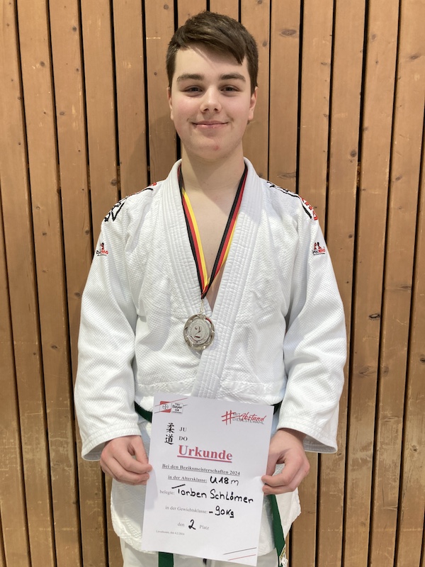 Bei den Bezirks Einzelmeisterschaften der U 18 in Leverkusen erreichte Torben Schlömer den zweiten Platz in der Klasse bis 90 kg