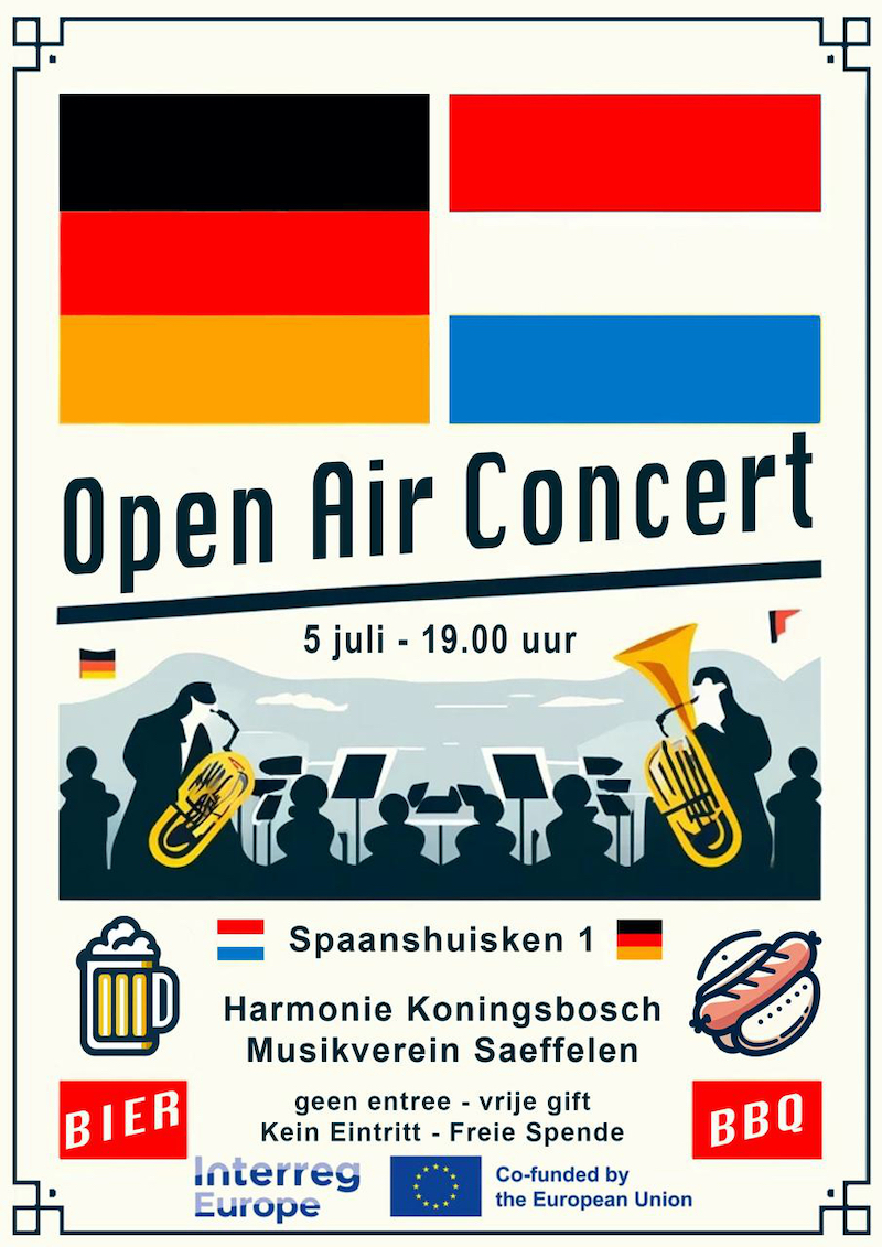 Der Musikverein „St. Gregorius“ Saeffelen und die Harmonie St. Cecilia Koningsbosch laden am Freitag, 05.07.2024 ab 18.00 Uhr erneut zu einem Dämmerschoppen-Open-Air-Konzert nach Spaanshuisken (NL) ein.