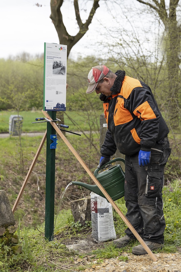 Pünktlich zu Ostern stellten Stephi und Erich Hacken (Ortsvorsteher) mit der Projektträgerin Gabriele Deyerling-Seidel 15 Informationstafeln auf.