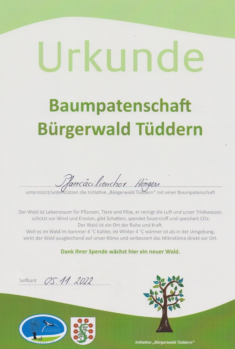 Gemeinsam mit der Familie Engendahl beteiligte sich der Pfarrcäcilienchor an der Baumpflanzaktion auf dem alten Sport- und Trainingsplatz in Tüddern.
