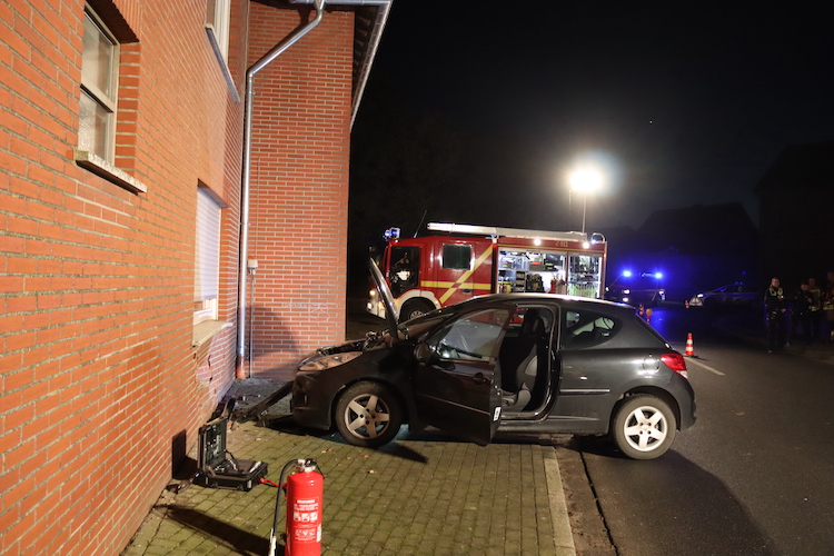 Nach einer Erstversorgung an der Unfallstelle wurde die Fahrerin des Peugeot zur weiteren Behandlung in ein Nahe gelegenes Krankenhaus transportiert. Die Schäden am Haus waren so massiv, dass die Einsatzkräfte der Feuerwehr einen Baustatiker zur Einschätzung der Lage anfordern mussten. In der Hauswand klaffte ein größeres Loch und ein Riss zog sich vom Erdgeschoss zum Obergeschoss. Selbst der Heizkörper im Haus wurde von der Wand gerissen. Die Einsatzkräfte sicherten die Heizungsanlage provisorisch und stabilisierten die Hauswand mit Holz und Baustützen. Nach rund zwei Stunden war der Einsatz für die Feuerwehr beendet.