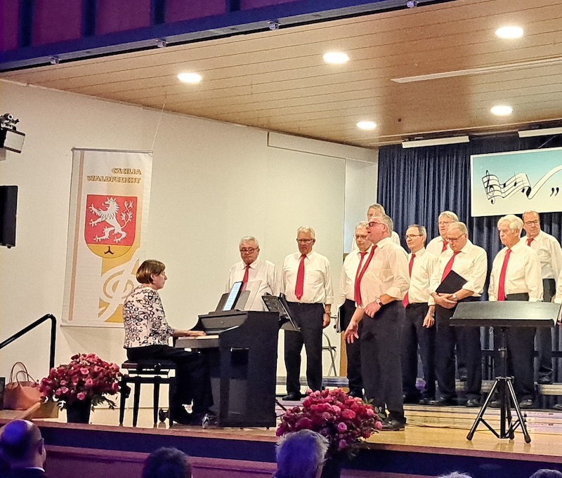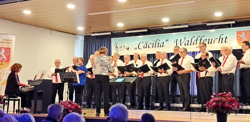 Mit „Bridge over troubled Water“ , dem Welterfolg von Simon & Garfunkel begeisterte Tenor Frank Bischofs als Solist das Publikum bevor die Waldfeuchter Sänger das Programm fortsetzten. Hits „Tage wie diese“ (Die Toten Hosen), „Sweet Caroline“ von Neil Diamond und „So eine Nacht“ von Guus Meuwis animierten die Zuhörer zum Mitsingen und sind ein Garant für gute Stimmung, zumal der Schlußrefrain von „So eine Nacht“ als Hommage an die Gastchöre in der original niederländischen Version (Het is een Nacht ) gesungen wurde.