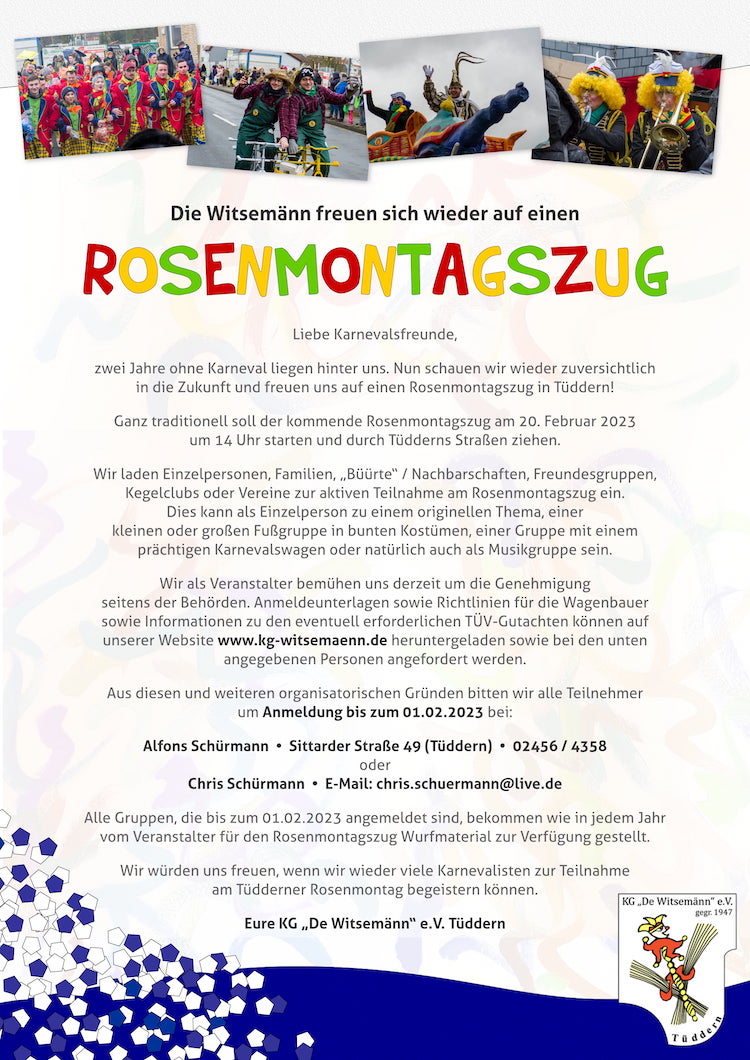Rechtzeitig zum Rosenmontagsumzug der Witsemänn anmelden!