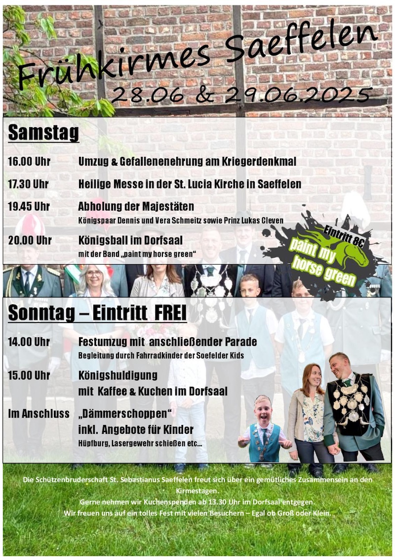 Der feierliche Auftakt zur Kirmes erfolgt am Samstagnachmittag 28.06.2025 um 16:00 Uhr mit dem Festaufzug. Am Abend findet der große Königsball statt. Nach der Abholung der Majestäten und ihres Gefolges am festlich geschmückten Königshaus im Neubaugebiet Hundsrath, nahe der niederländischen Grenze, erfolgt die offizielle Königshuldigung. Ab 21:00 Uhr sorgt die Band „Paint My Horse Green“ für ausgelassene Stimmung und gute Laune bei den Gästen aus nah und fern.