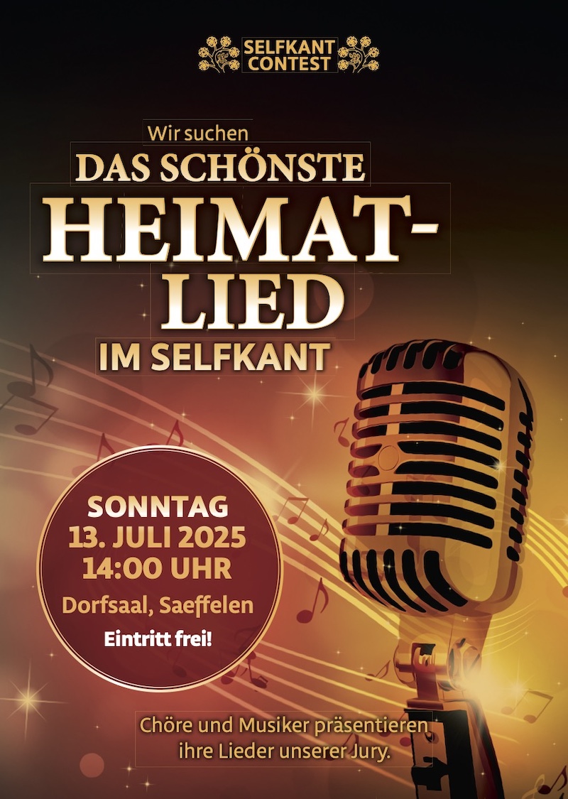 Die Heimatvereinigung und Heinz Eschweiler präsentieren den Songcontest zur Suche nach dem schönsten Heimatlied im Selfkantland. Im Wettbewerb stellen sich der Mundartchor Selfkant, Männergesangsverein Höngen, Pfarrcäcilienchor Selfkant, Chor Schalbruch, HatWat, Heinz Quix und Partner sowie Solisten mit Wohnzimmerheld Jörg Schürgers, Heinz Büff Ernst, Toni Boden der Jury mit Dorothea Blohm, Christoph Esser, Jens Fleischer, Willi Weindorf und Günter vom Dorp (einstiger WDR4 Moderator).