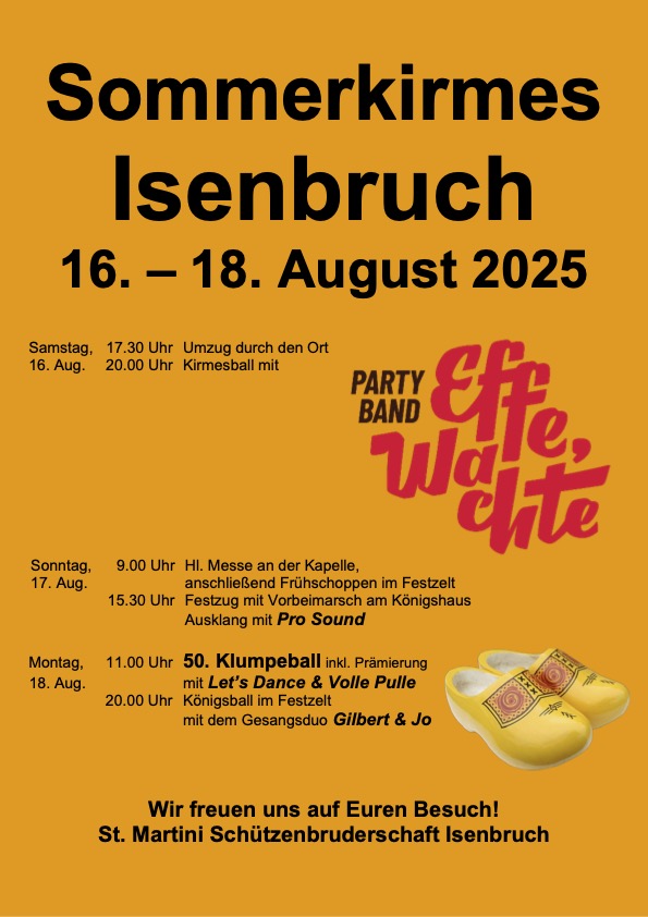 Am kommenden Samstag (07.02.2026) ist es wieder soweit. Dann startet auch im westlichsten Ort Isenbruch der Karneval. Ab 20.11Uhr geht es im Schöttehuus (Grünstr. 17) wieder richtig zur Sache, denn die Isenbrucher verstehen es richtig Karneval zu feiern. Das sieht man auch bei den Karnevalsumzügen in der