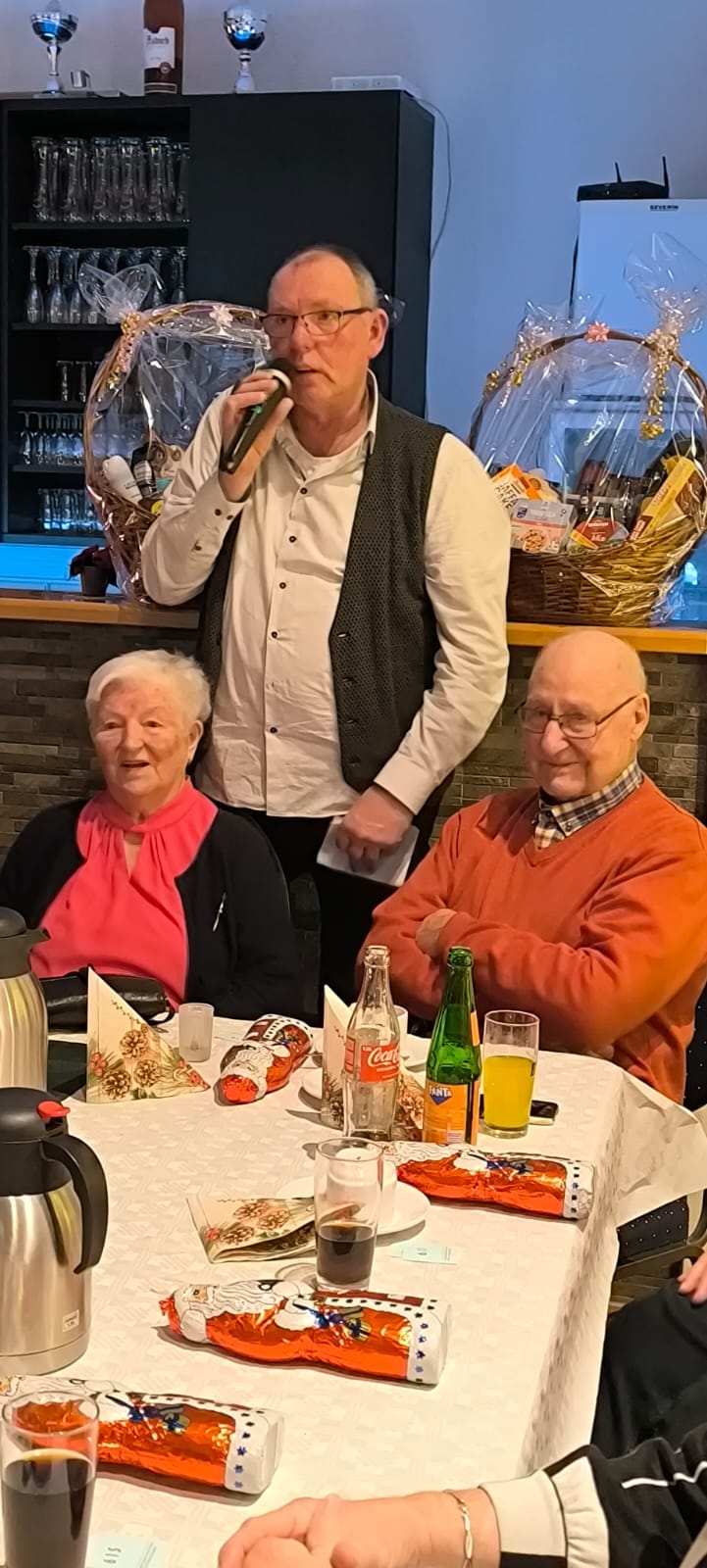 Zum Schluss wurden dann die ältesten Gäste in den Vordergrund gestellt. Die älteste Frau mit 95 Jahren war Mia Huben und der älteste Mann mit 94 Jahren war ihr Ehemann Ludwig Huben. Die beiden sind seit 71 Jahre verheiratet.