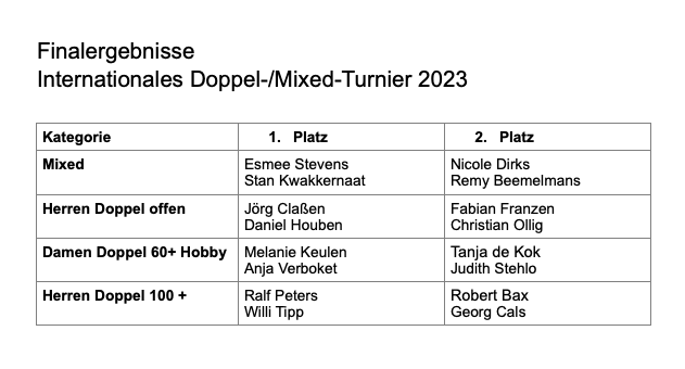 Zum 37. Mal in Folge wurde bei überwiegend angenehmen Wetterbedingungen auf der Anlage des TC Selfkant Westerheide in der Woche vom 28.08.- 03.09. 2023 das bekannte Mixed-Doppelturnier ausgetragen. Gespielt wurde in vier Kategorien, die den ZuschauerInnen viele sehr spannende und mitreißende Spiele präsentierten.