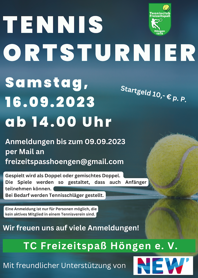 Der Tennisclub Freizeitspaß Höngen e. V. veranstaltet in diesem Jahr nach mehrjähriger Pause wieder ein Ortsturnier auf der Tennisanlage in Höngen (Prunkweg). Am 16. September 2023 ab 14.00 Uhr können dabei alle Personen, die aktuell kein aktives Mitglied in einem Tennisverein sind oder sogar noch nie einen Tennisschläger in der Hand gehabt haben, in Turnierform gegeneinander antreten.