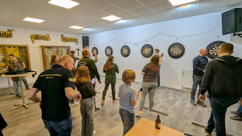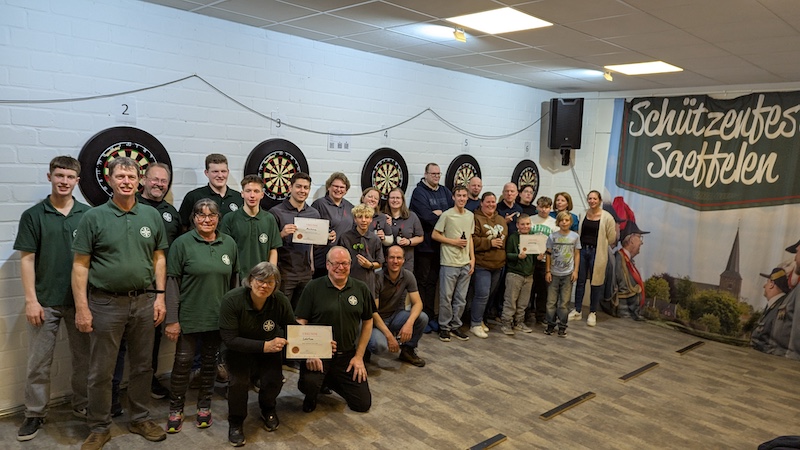 Diese Spezialserie von Darts-Turnieren wird explizit nur für Saeffelener Vereine ausgerichtet um das Miteinander zu fördern. Dabei lag der Fokus auch darauf, Anfängern und Ungeübten aus dem eigenen Ort die Möglichkeit zum Wetteifern zu geben. Zugelassen zum Turnier waren nur Vereine aus Saeffelen/Heilder. Angetreten sind der Musikverein, der Spielmannszug, die Soefelder Kids und die Schützen um den besten Verein und den besten Einzelspieler zu ermitteln. Viele Gesichter vom ersten Turnier aus dem letzten Jahr waren wieder anwesend. Mit Rücksicht auf die Darts-Anfänger wurden die üblichen Dart-Regeln angepasst. Insbesondere mit Single-out wurde das Spiel vereinfacht, getreu dem Motto: „Kennst du das Gefühl, wenn dein Pfeil beim ersten Wurf in das passende Double-Feld trifft und du gewonnen hast?……. Ja, ich auch nicht.“. Zwischen den einzelnen Spielen konnten sich die Spieler mit kühlen Getränken und Pizzabrötchen stärken.