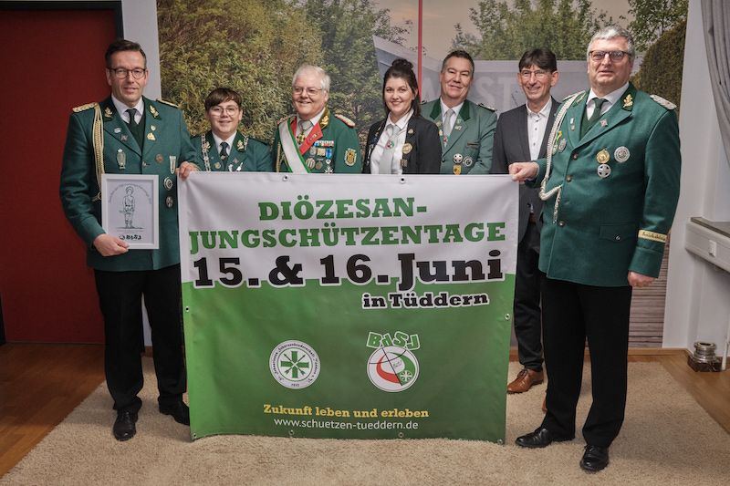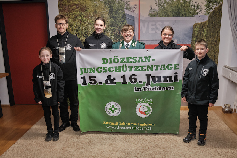Tüddern. Am 13. Januar erhielten die Vertreter der St. Sebastianus-Schützenbruderschaft Tüddern aus den Händen der Vertreter des BdSJ-Diözesanverbandes die Ausrichter-Urkunde für die Diözesanjungschützentage 2024, welche vom 15. bis 16. Juni 2024 stattfinden. Zu diesem Anlass trafen sich die Tüdderner Jungschützen mit Schülerprinzessin Luna Hamacher, Jugendprinz Bas Ruers sowie dem amtierenden Diözesanschülerprinzen Ian Ruers mit dem Bürgermeister und Schirmherrn Norbert Reyans.