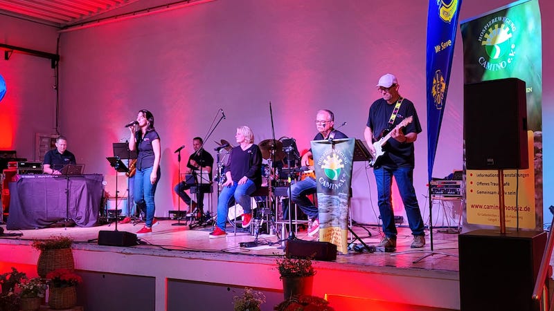 Kühle Getränke war ausreichend vorhanden und für die Stimmung sorgte die Band Kreuzweise aus Wassenberg. Die kleinen Geschichten eingebettet zwischen den Songs der Band mit ihrem Programm „Unbekannte Reise“ kamen bei den Gästen sehr gut an. Die beliebte Rock- und Popmusik von Thorsten Odenthal und die nachdenklichen Texte von Dr. Titus Reinmuth – unter anderem im WDR verantwortlich für „Kirche im WDR“ – regten teils zum Nachdenken an. Die insgesamt 10 Personen umfassende Band Kreuzweise (incl. Techniker) spielte schon auf evangelischen und katholischen Kirchentagen mit großem Erfolg. Diesen Erfolg konnte das Publikum in der Bürgerhalle Würm nun nachvollziehen und war vollauf begeistert.