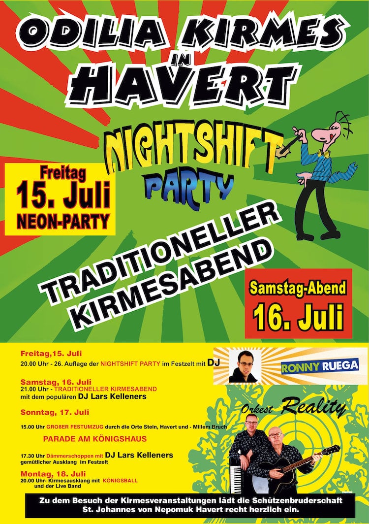 Den festlichen Auftakt zur Odilia Kirmes bildet am Freitag, den 15. Juli die 26. Auflage der Nightshift Party. Für beste Stimmung und Unterhaltung sorgt DJ Ronny Ruega. Fortgesetzt wird das Fest am Samstag, den 16.Juli. Der Spielmannszug Edelweiß Havert und der Vorstand der Schützenbruderschaft treffen sich um 18.00 Uhr bei Meuwissen in Stein zum Zapfenstreich. Dann geht es zum Königshaus, wo dem Königspaar einige Ständchen gebracht werden. Nach einer kleinen Stärkung und einem Umtrunk marschiert der Zug dann zum Festzelt und eröffnet um 21.00 Uhr dem traditionellen Kirmesabend. Für gute Laune und beste Unterhaltung sorgt der populäre DJ Lars Kelleners. Der Sonntag, 17. Juli, ist Antreten um 08.45 Uhr am Festzelt zum gemeinsamen Kirchgang. Die Messe beginnt um 09.00 Uhr. Dann wird zum Festzelt gezogen. Bei einem kleinen Festakt werden verdiente Schützenbrüder für 10 und 25 jährige Mitgliedschaft in der Bruderschaft geehrt. Mit einem Frühschoppen klingt dann der Sonntag Vormittag aus.