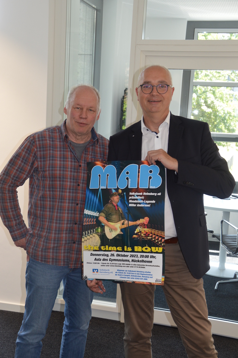 Der frühere Pressesprecher der Bank, Roland Meintz, der Miller Anderson 2019 nach Hückelhoven geholt hatte, konnte die Kulturverantwortlichen der Volksbank Heinsberg für eine Wiederauflage des Konzertes begeistern, das nun zur Freude aller Blues- und Rockmusikfreunde am Donnerstag, 26. Oktober 2023, 20 Uhr (Einlass 19 Uhr) in der Aula in Hückelhoven über die Bühne gehen wird.