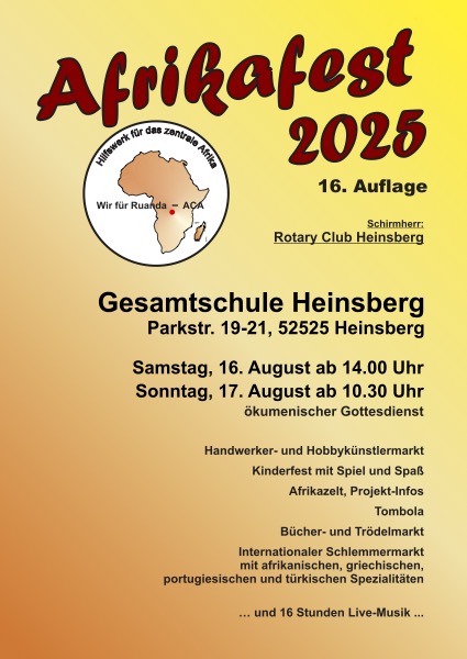Heinsberg-Oberbruch. Das 16. Afrikafest des Vereins WIR FÜR RUANDA, der im vergangenen Jahr sein 30-jähriges Bestehen feierte, findet am 16. und 17. August 2025 im Schulzentrum in Heinsberg-Oberbruch, Parkstraße 19-21, statt. Die Planungen hierzu laufen aktuell auf Hochtouren. Als Schirmherren konnte das Planungsteam um den Vorsitzenden Dr. Bernd Bierbaum den Rotary Club Heinsberg gewinnen.